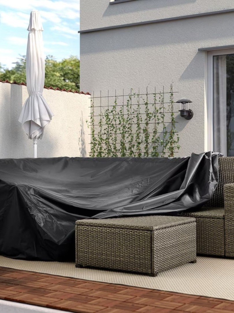 Чтобы чехол оставался на месте в ветреные дни, затяните нижнюю часть с помощью шнурка который продет по всему периметру ткани и заправьте нижние края под углы мебели.