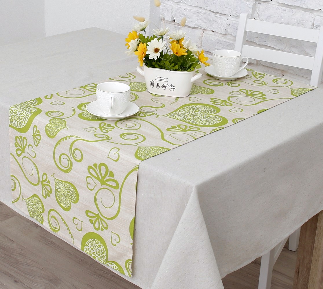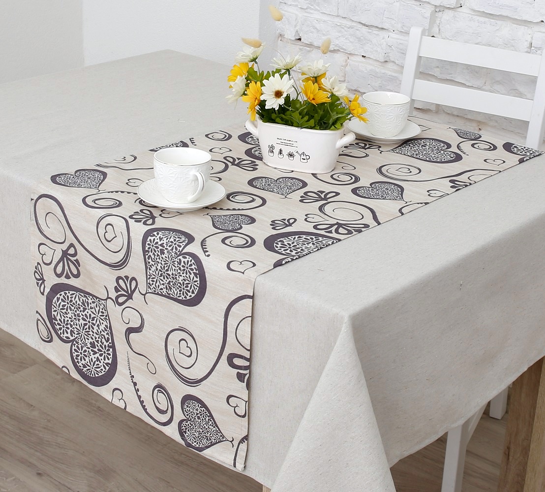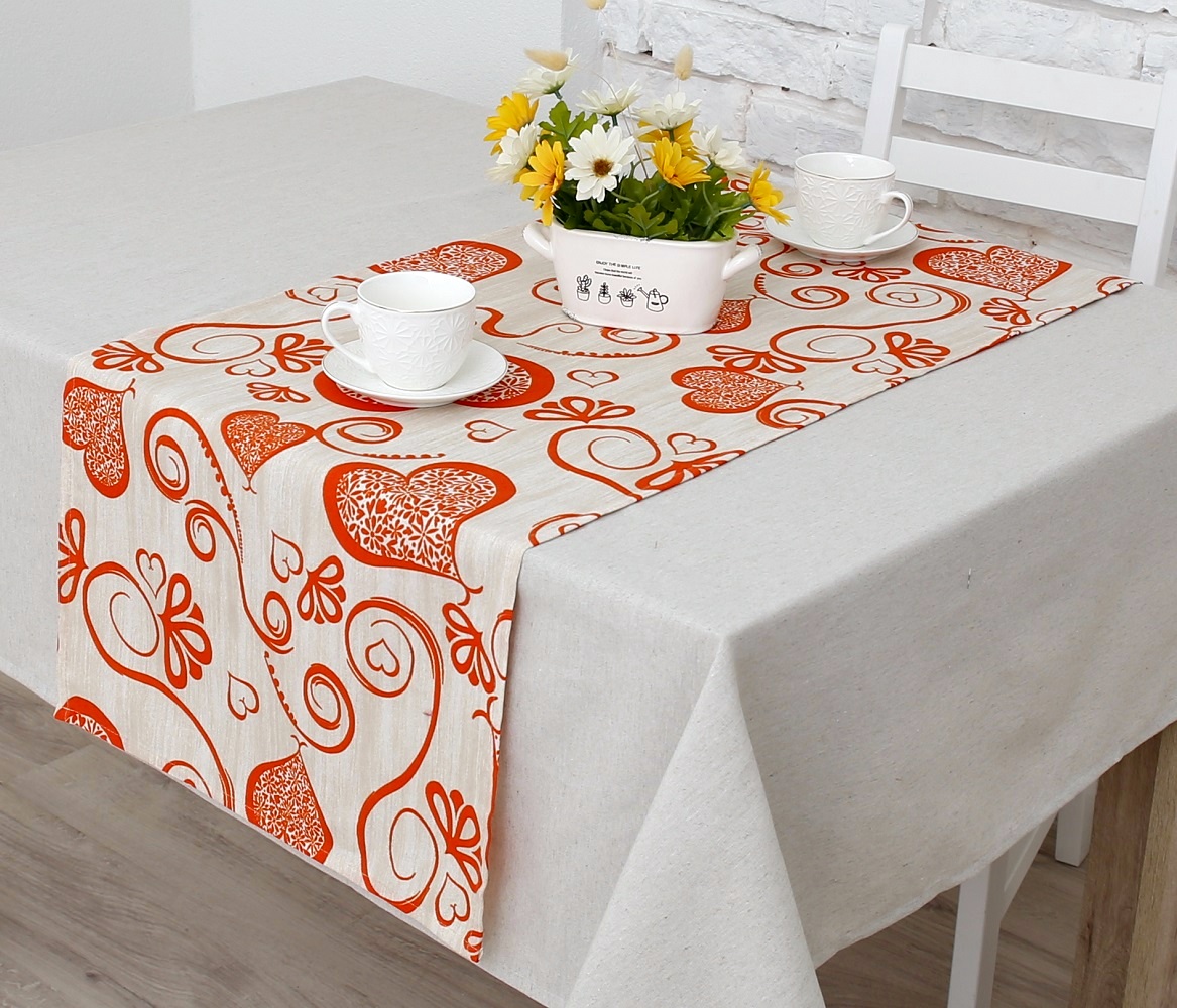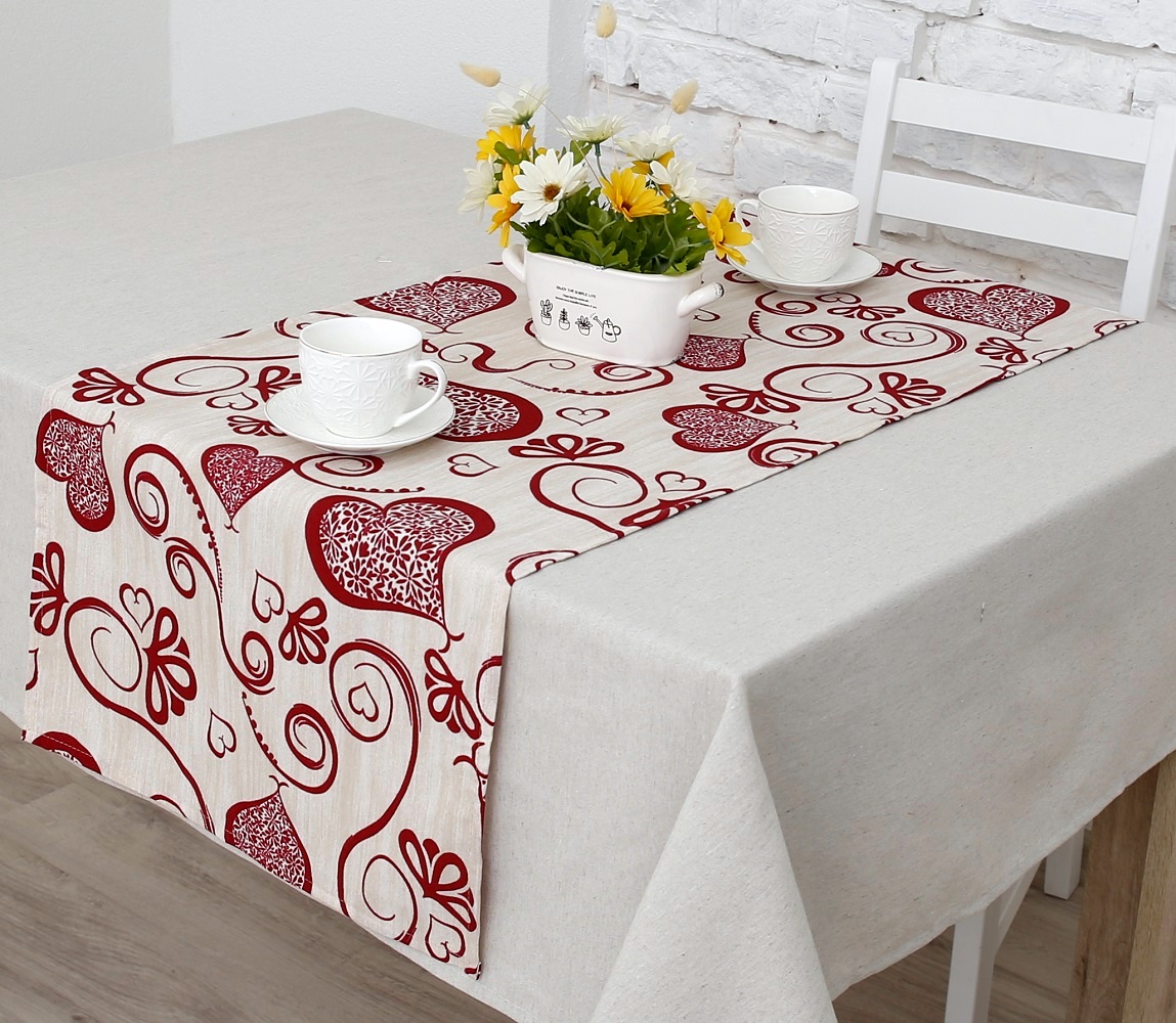 Также Дорожку на стол Амур (позитив) можно стелить поверх скатерти, тем самым комбинируя ткани и делая акцент на фактуре стола.