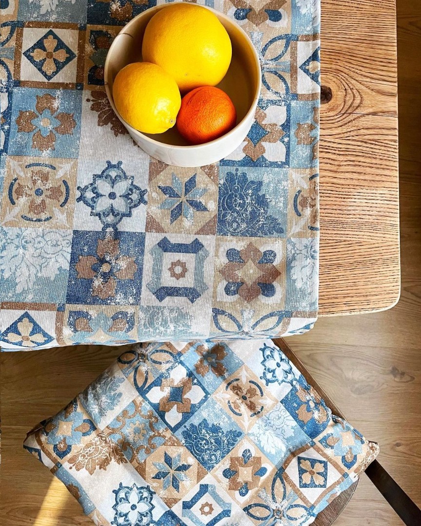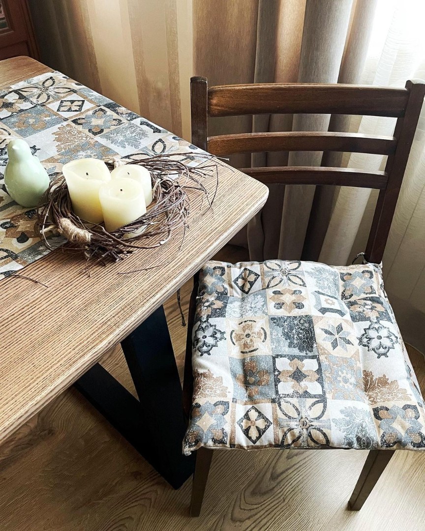 Также Дорожку на стол Майолика можно стелить поверх скатерти, тем самым комбинируя ткани и делая акцент на фактуре стола.