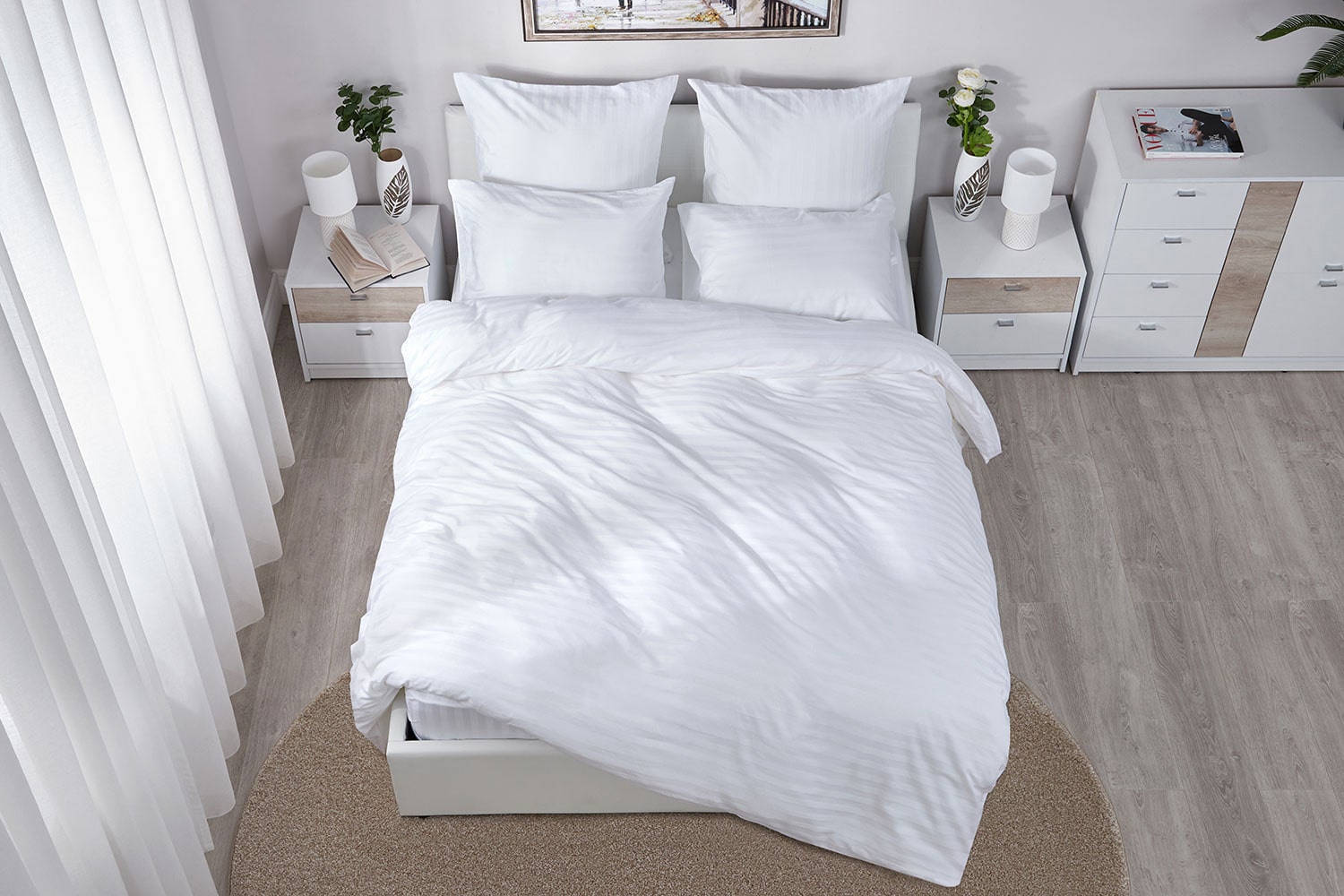 Комплект постельного белья двуспальный Stripe (страйп-сатин) изготовлен из хорошо скрученных хлопчатобумажных нитей. Эта технология придает особый блеск и атласную поверхность ткани.