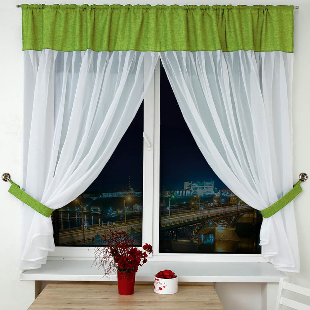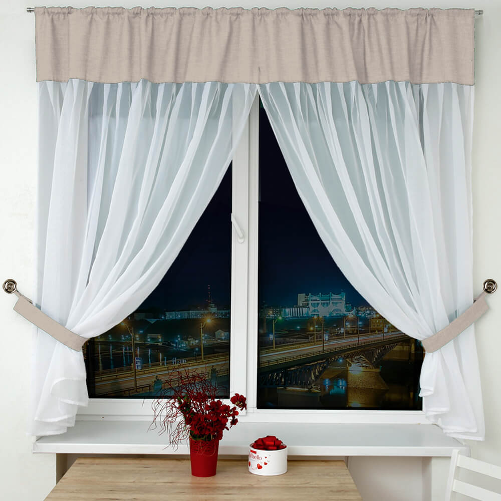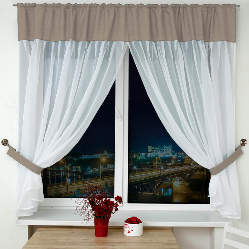 Комплект штор Фальсо на ленте — это комплект плотной хлопковой ткани с комбинированием вуали, также мы комплектуем боковые шторы подхватами в цвет хлопковой ткани, чтобы изделие выглядело завершённым.