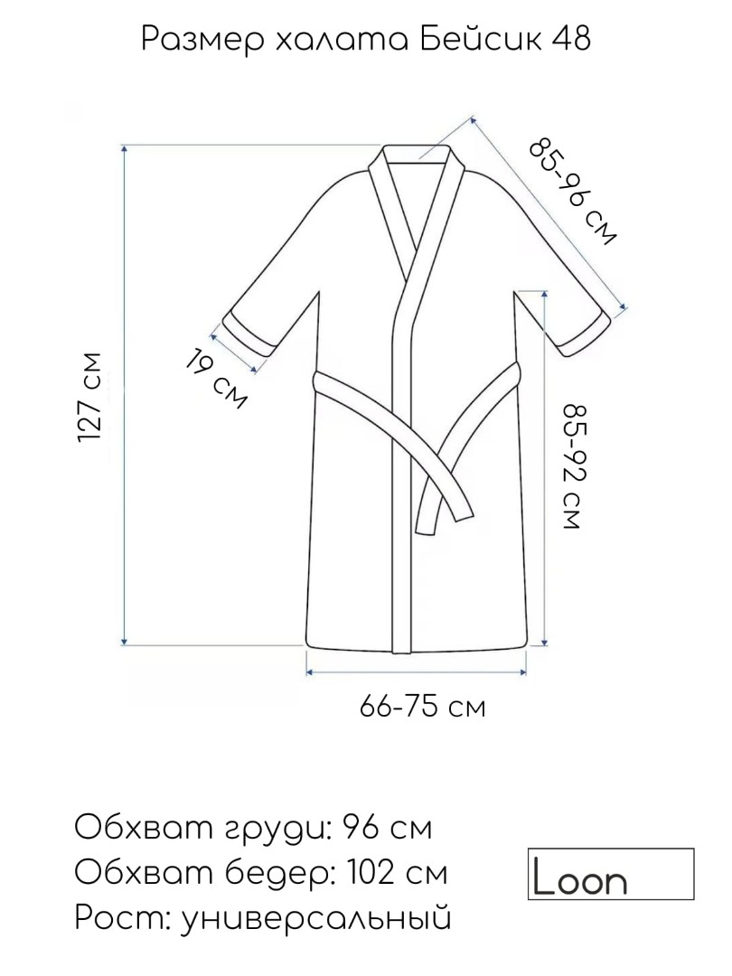 Размер: модельный 48 (p.s. чем больше размер халата, тем лучше вы сможете укутаться в него), плотность ткани 380 гр/м2. Халат модели унисекс, что делает его универсальным, не линяет и не теряет свой цвет даже после многочисленных стирок.