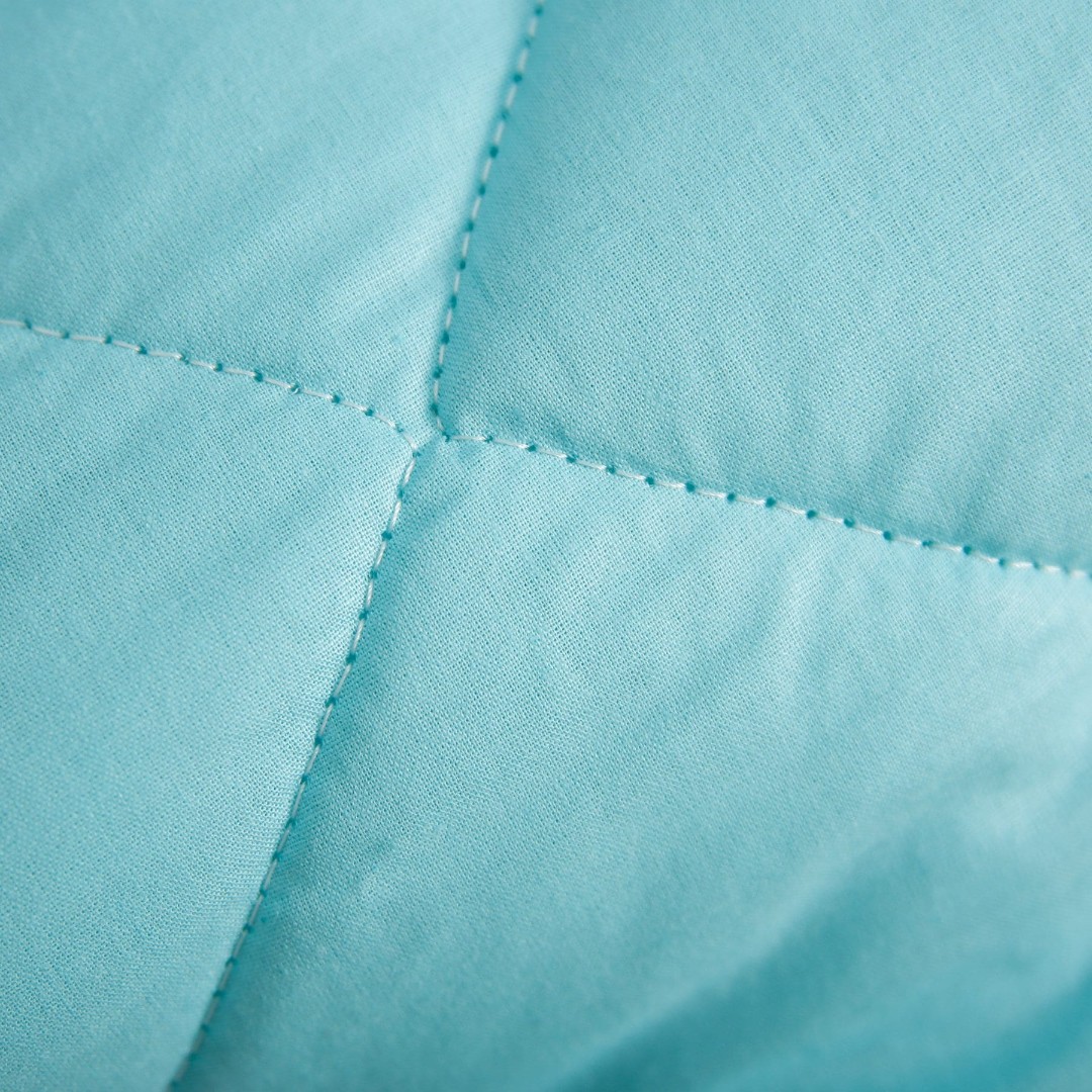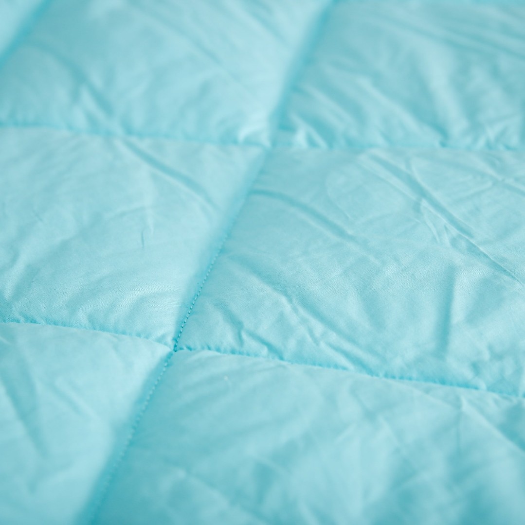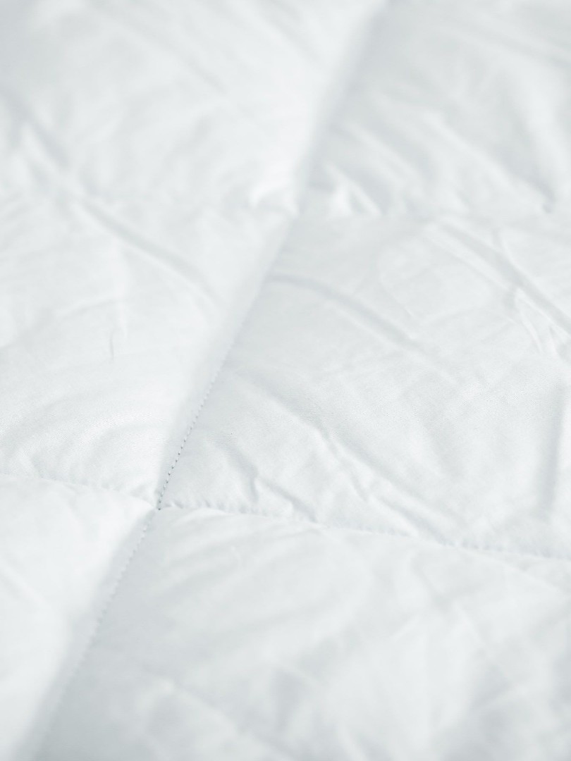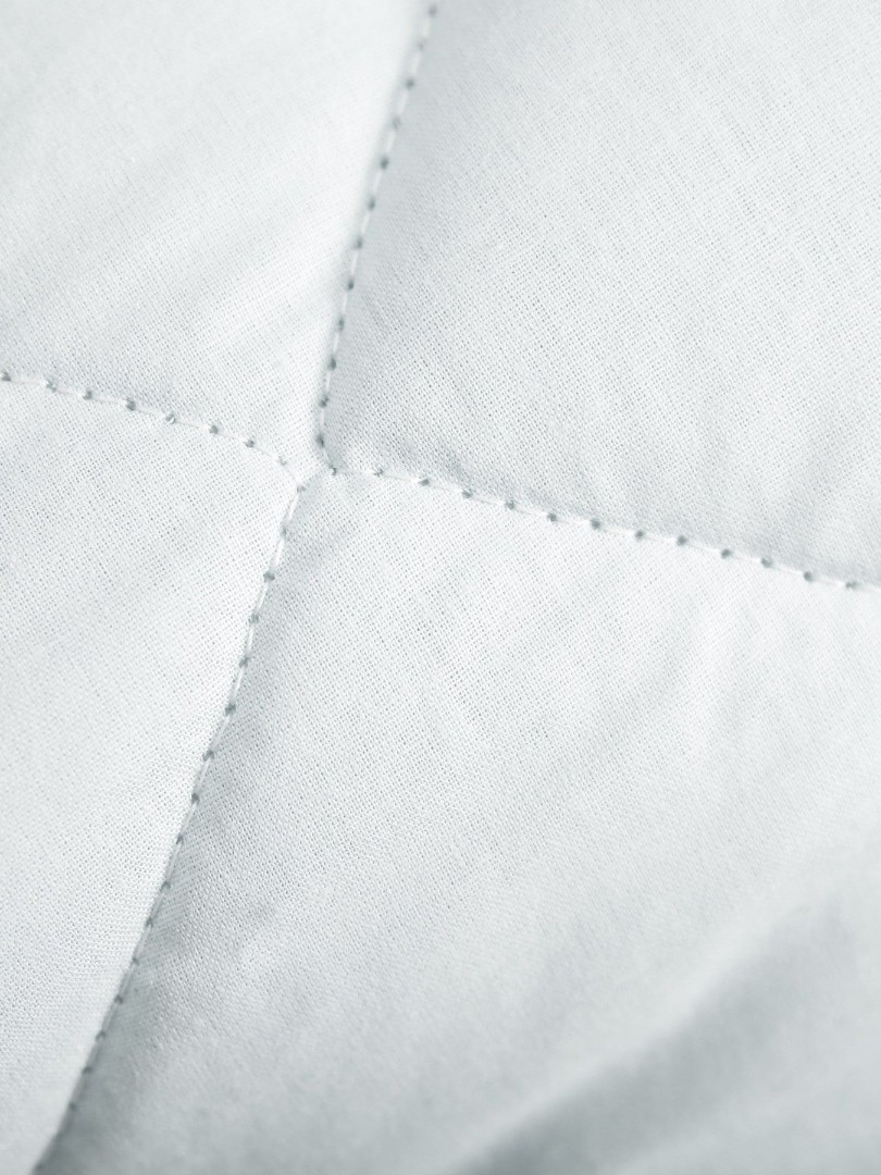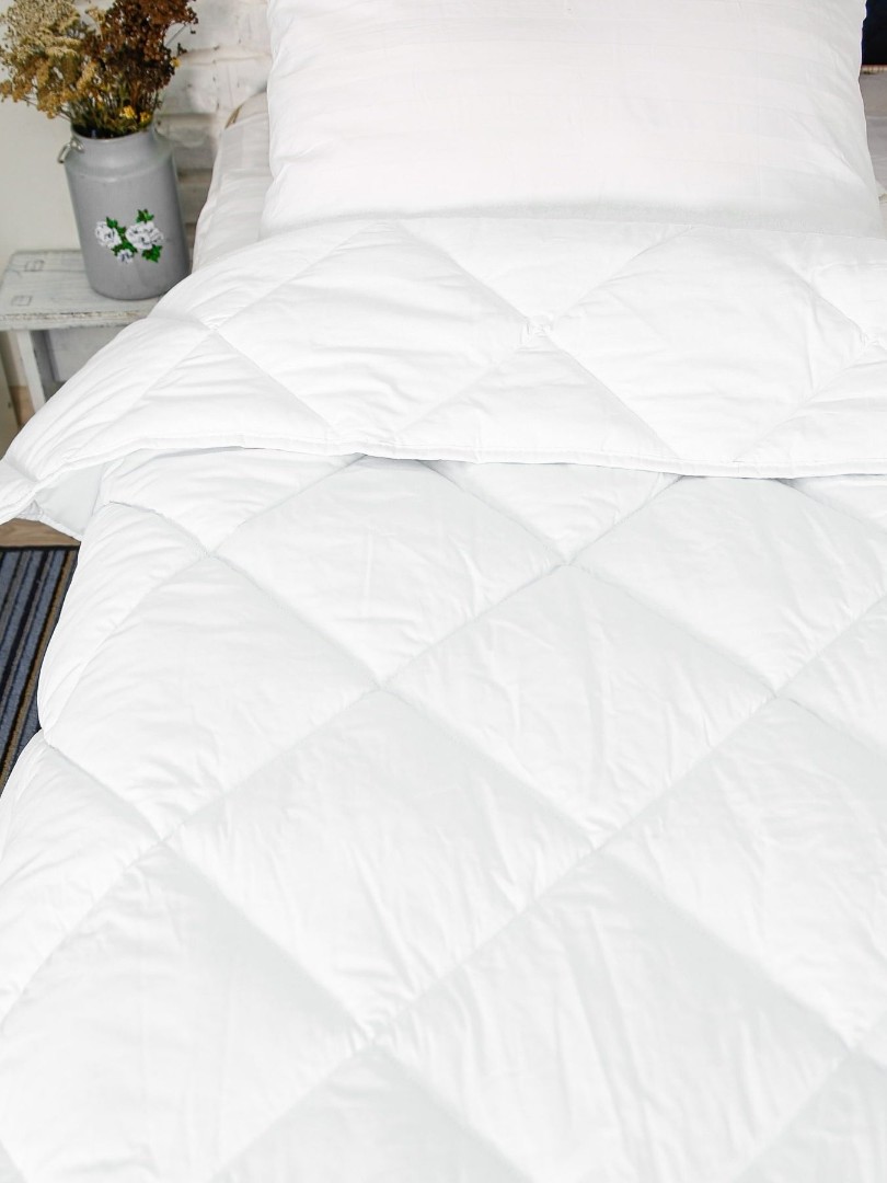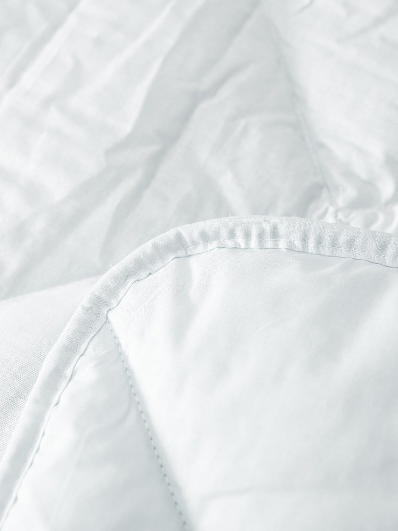 Ткань чехла бязь белоснежного цвета, которая состоит из 100% хлопка, без добавления полиэстера, прочная и одновременно нежная и гладкая на ощупь, имеющая матовую поверхность. Благодаря специальной обработке одеяла для сна и стежке ткани наполнитель не пробивается сквозь основной чехол изделия и выдерживает большое количество стирок.
