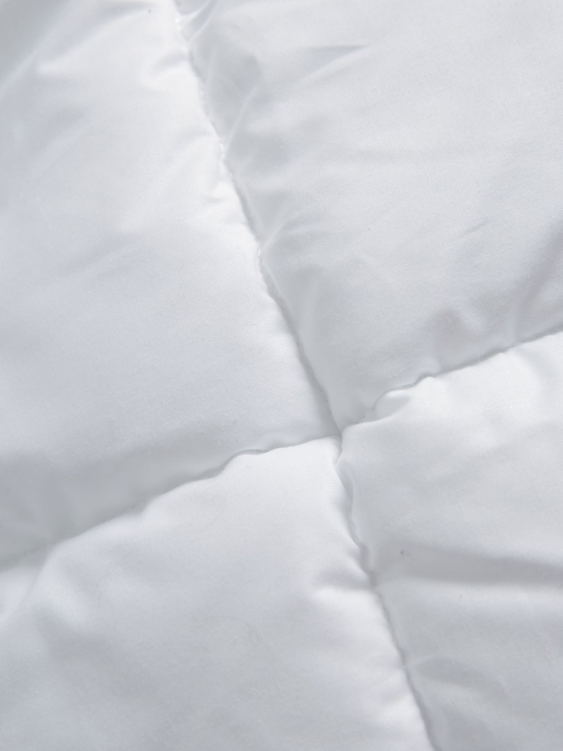 Ткань чехла сатин белоснежного цвета, которая состоит из 100% хлопка, без добавления полиэстера, прочная и одновременно нежная и гладкая на ощупь, имеющая матовую поверхность. Благодаря специальной обработке одеяла для сна и стежке ткани наполнитель не пробивается сквозь основной чехол изделия и выдерживает большое количество стирок.
