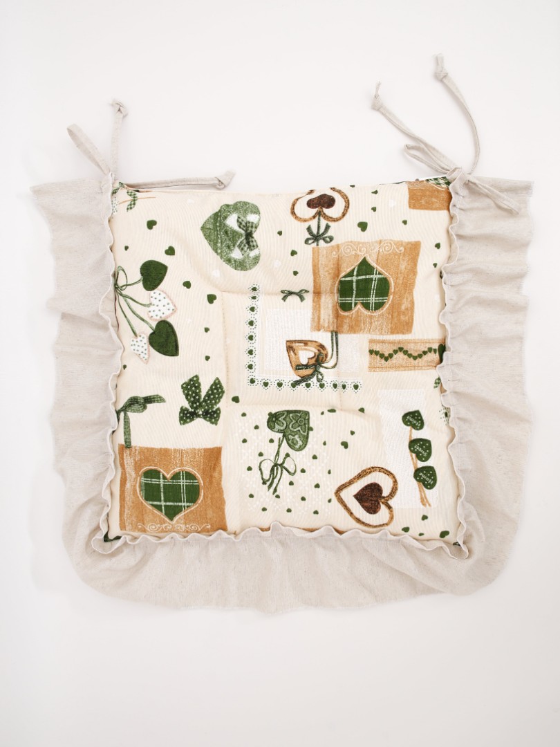 Подушка для сидения Яна не боится стиральной машины и неравномерного сбивания наполнителя. Очень легко крепится с помощью 2 завязок. Наполнитель — ватин + синтепон.