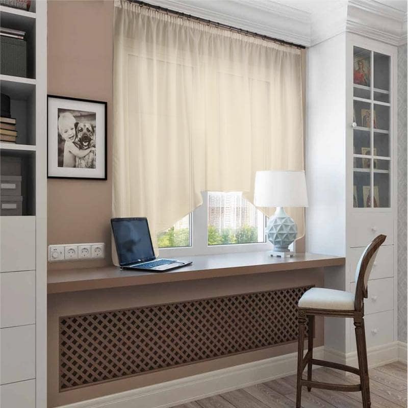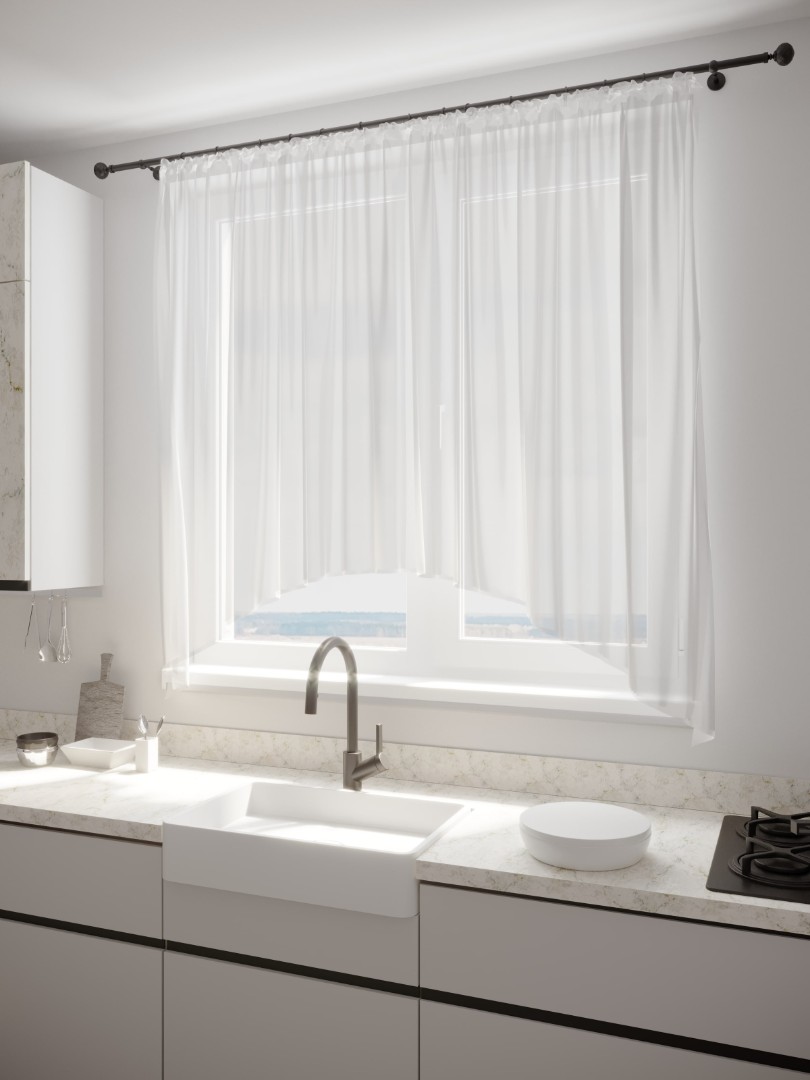 К верхней части тюль пришита шторная лента с тесьмой, с её помощью вы сможете стянуть изделие до нужного вам размера карниза.