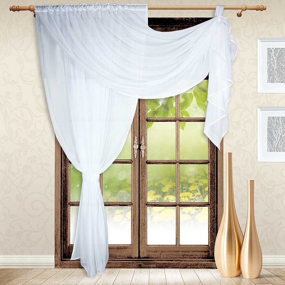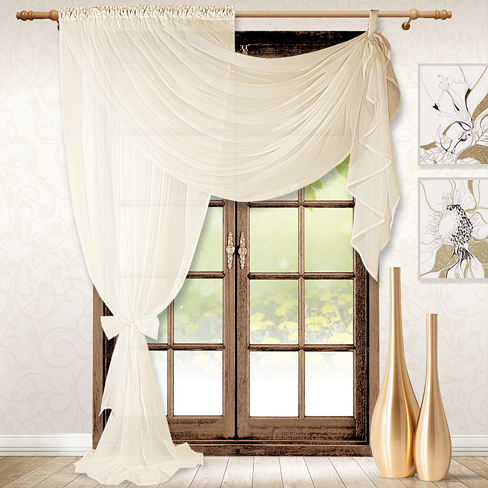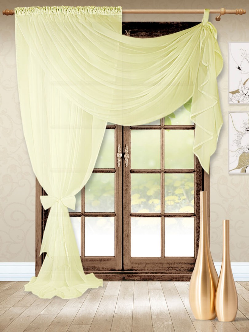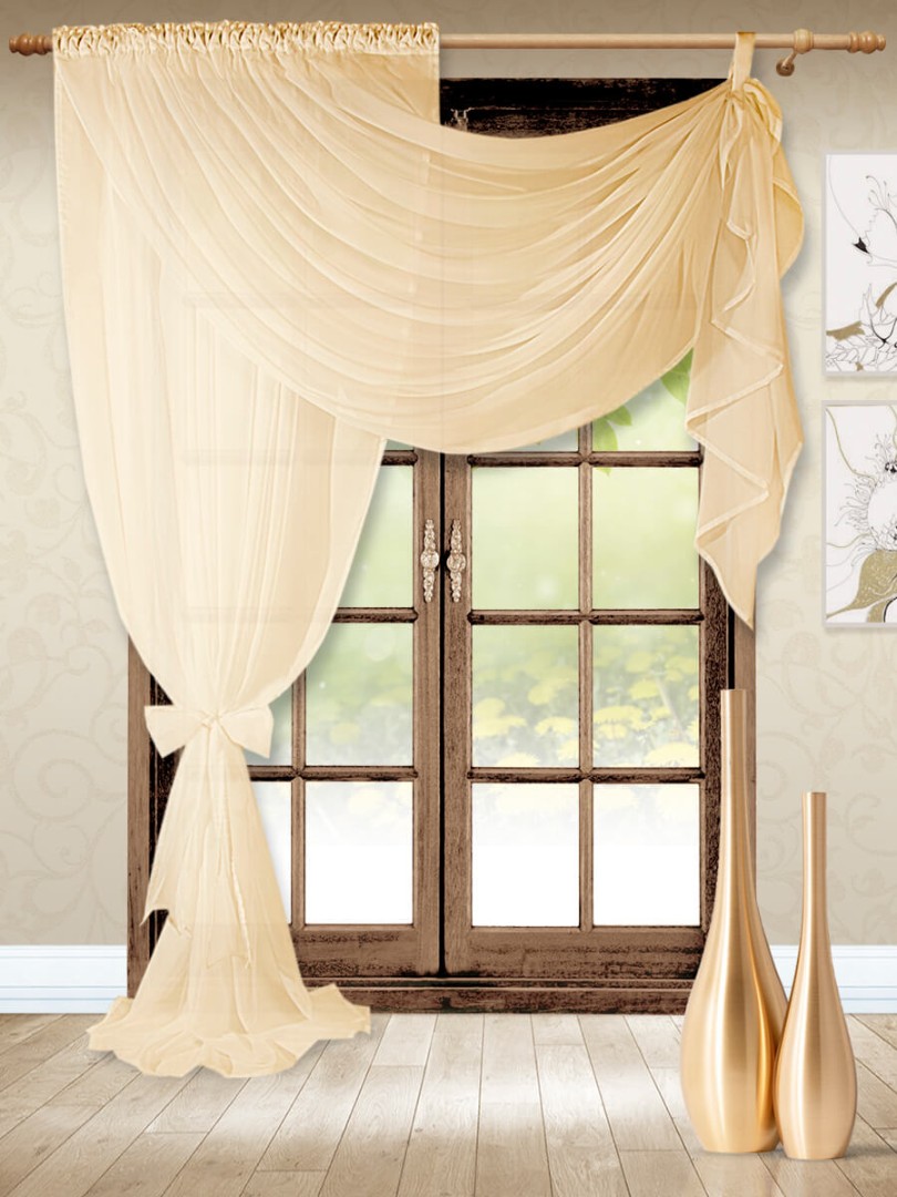 Модель изумительно смотрится, когда большое количество вуали лежит на полу, поэтому смело можете выбирать высоту больше, чем расстояние от карниза до пола.