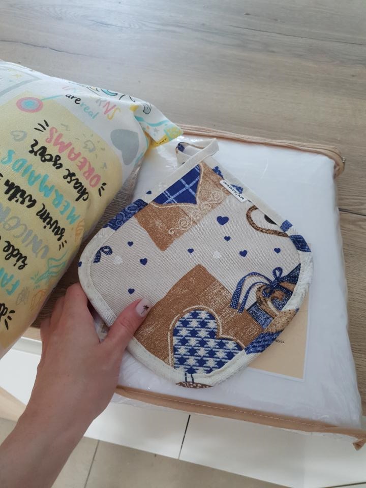 Получила посылку очень быстро! Заказывала штору ^Пэрри^, подушку в виде сердца и сумку-шоппер с бантом. Все очень хорошего качества. Надзейка добавила подарок-миленькую прихватку. Всем рекомендую покупать домашний текстиль только в Надзейке!