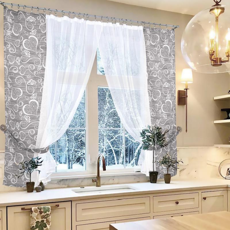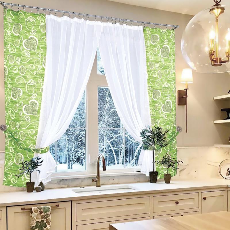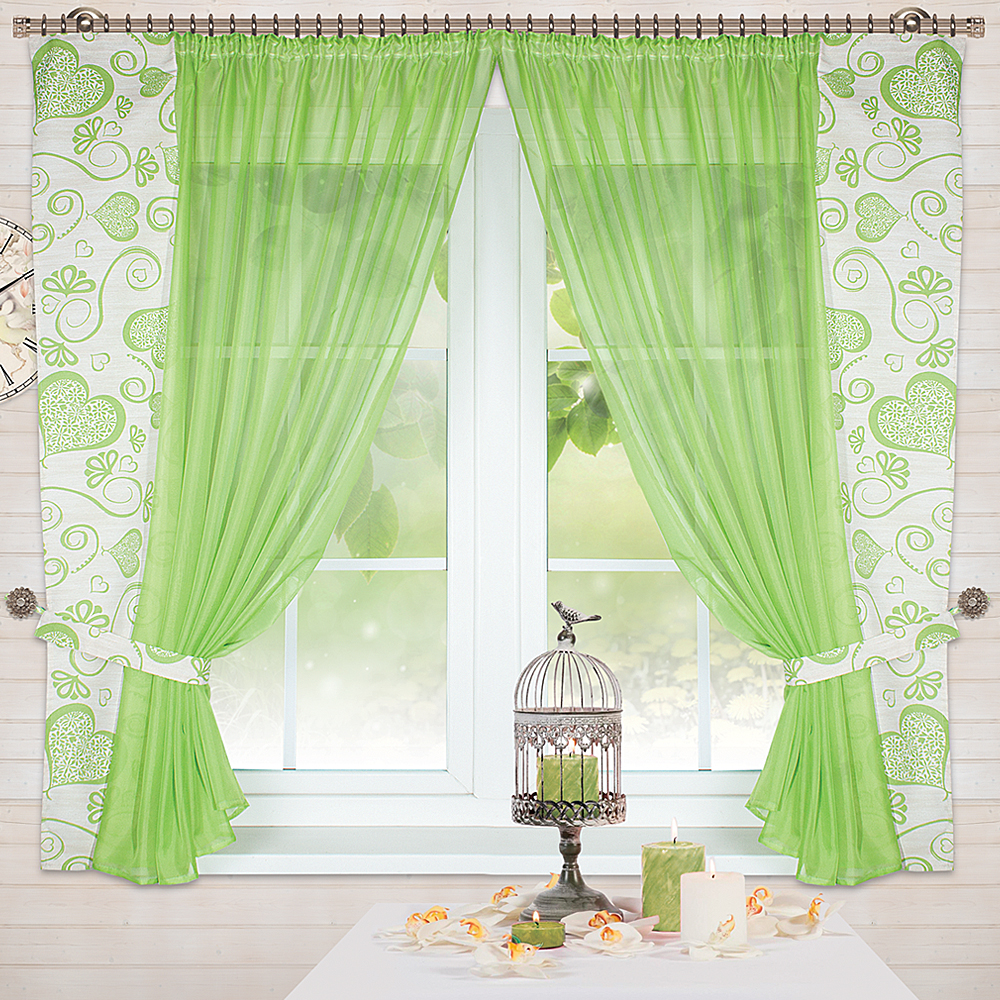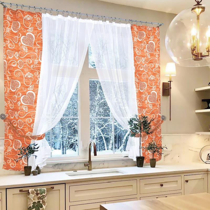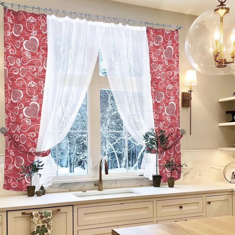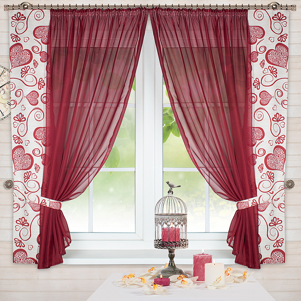 Шторы Амур — это сочетание белой воздушной вуали с хлопковой тканью (с сердечками), которая пришивается сбоку, также мы комплектуем боковые шторы подхватами в цвет хлопковой ткани с сердечками, чтобы изделие выглядело завершённым.