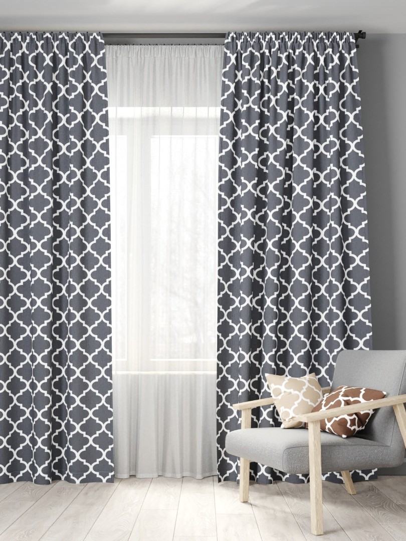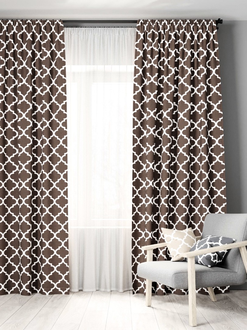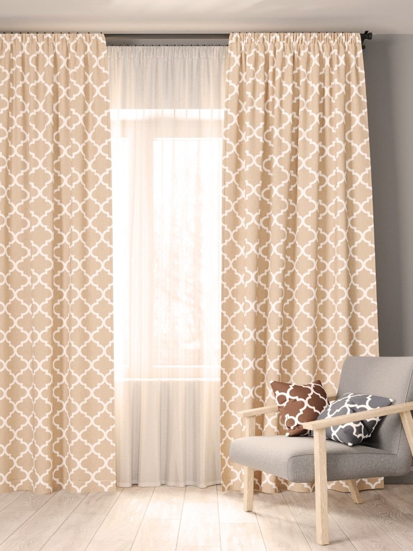Классический комплект штор с прочным рисунком, верхнюю часть штор мы драпируем тесьмой, чтобы можно было образовать вертикальные складки по всей площади шторы, так как частые складки придают шторам эффект «пышности» и «элегантности».