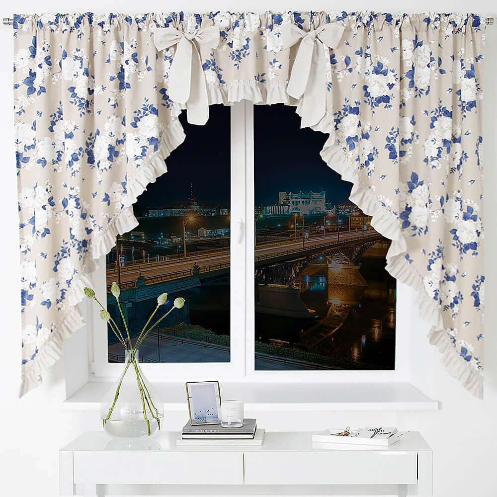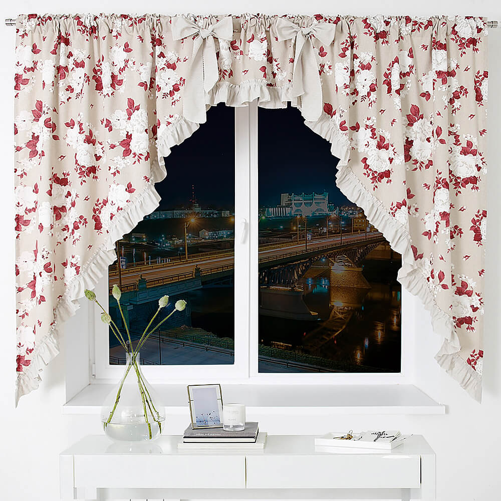 По периметру штор Дарья пришиваются рюши в цвет изделия, для придания шторы лёгкости и завершённости, также в комплект входят 2 бантика, которые вы сможете завязать по вашему желанию.