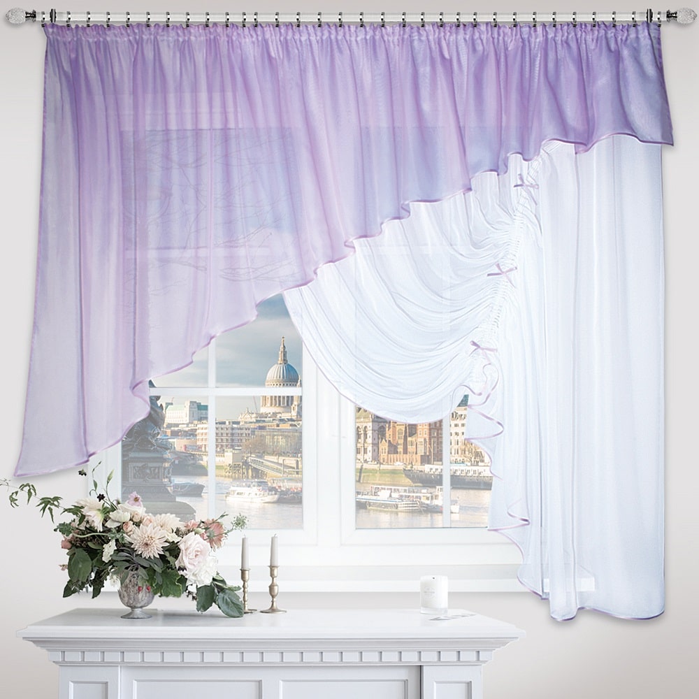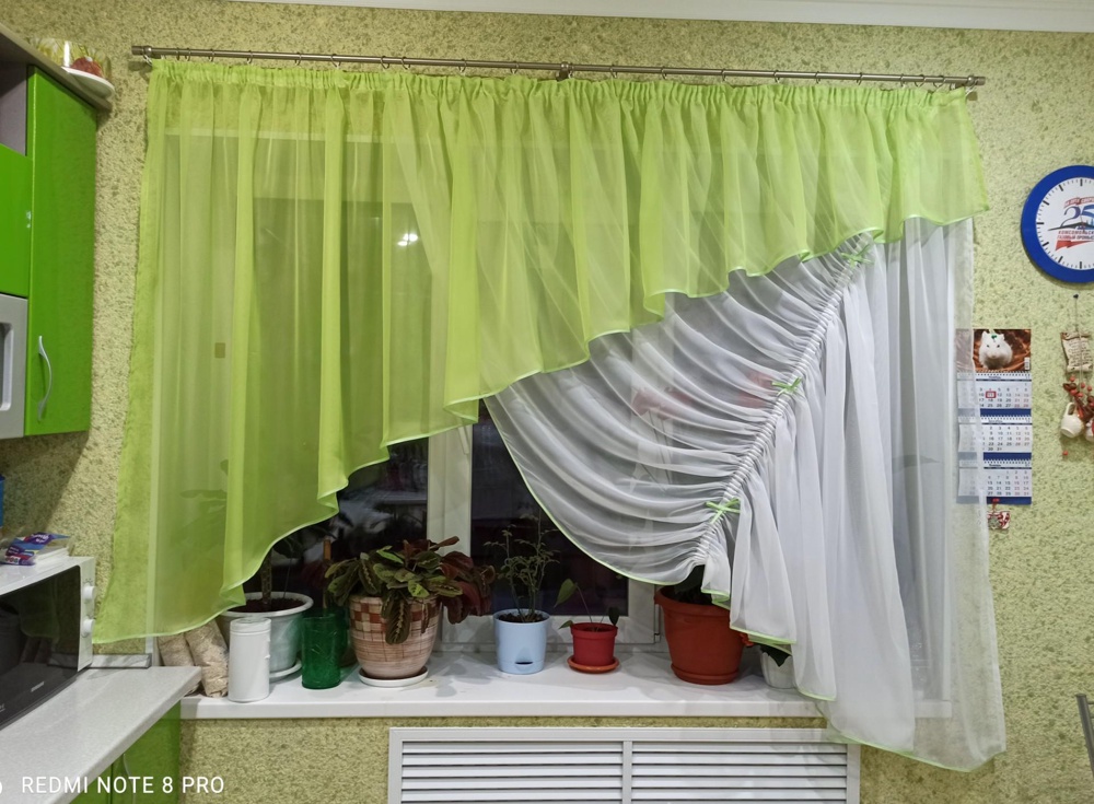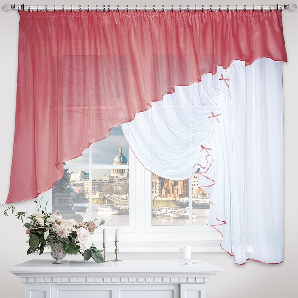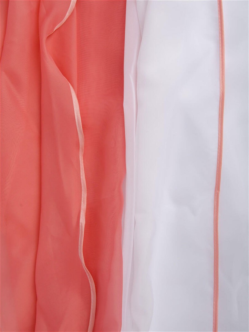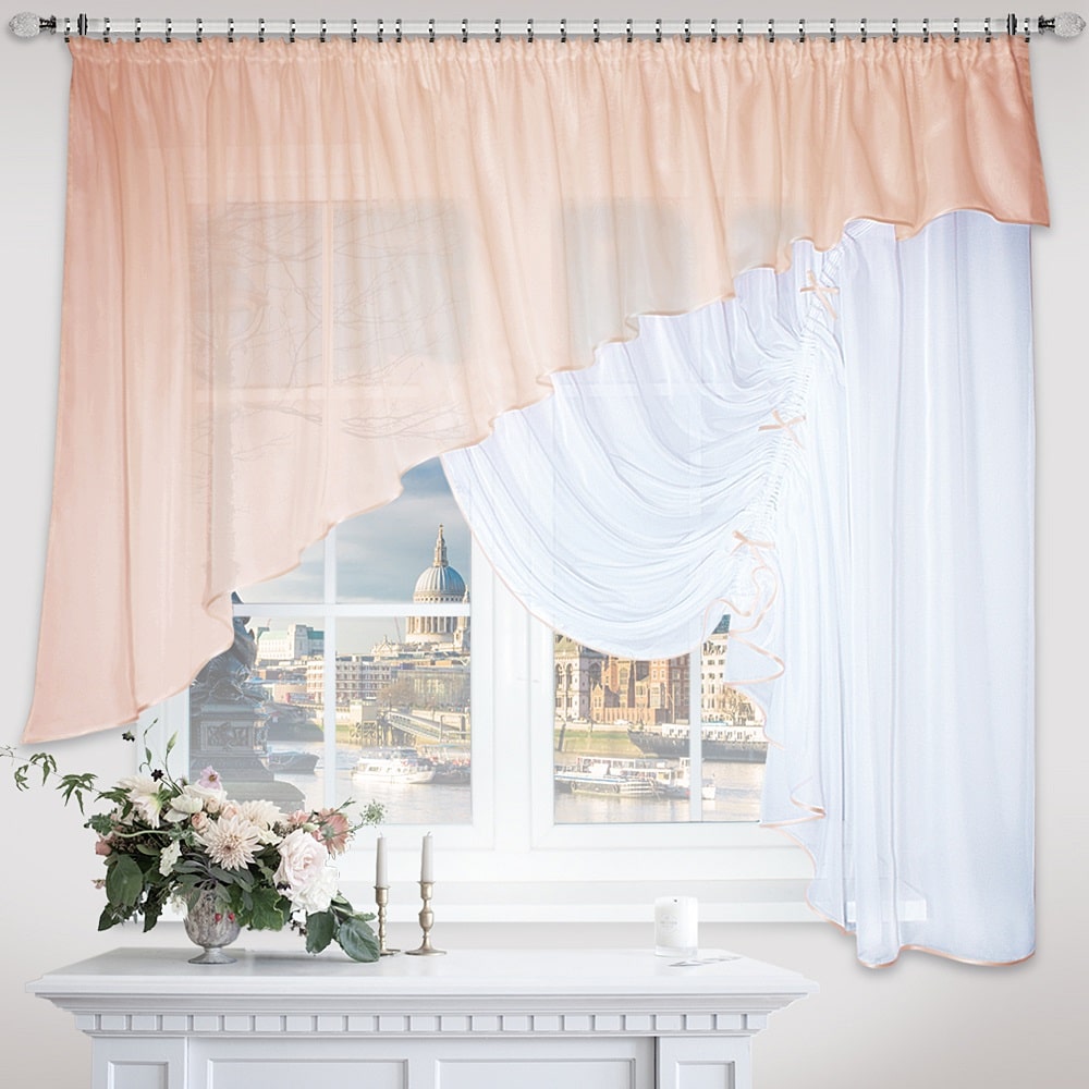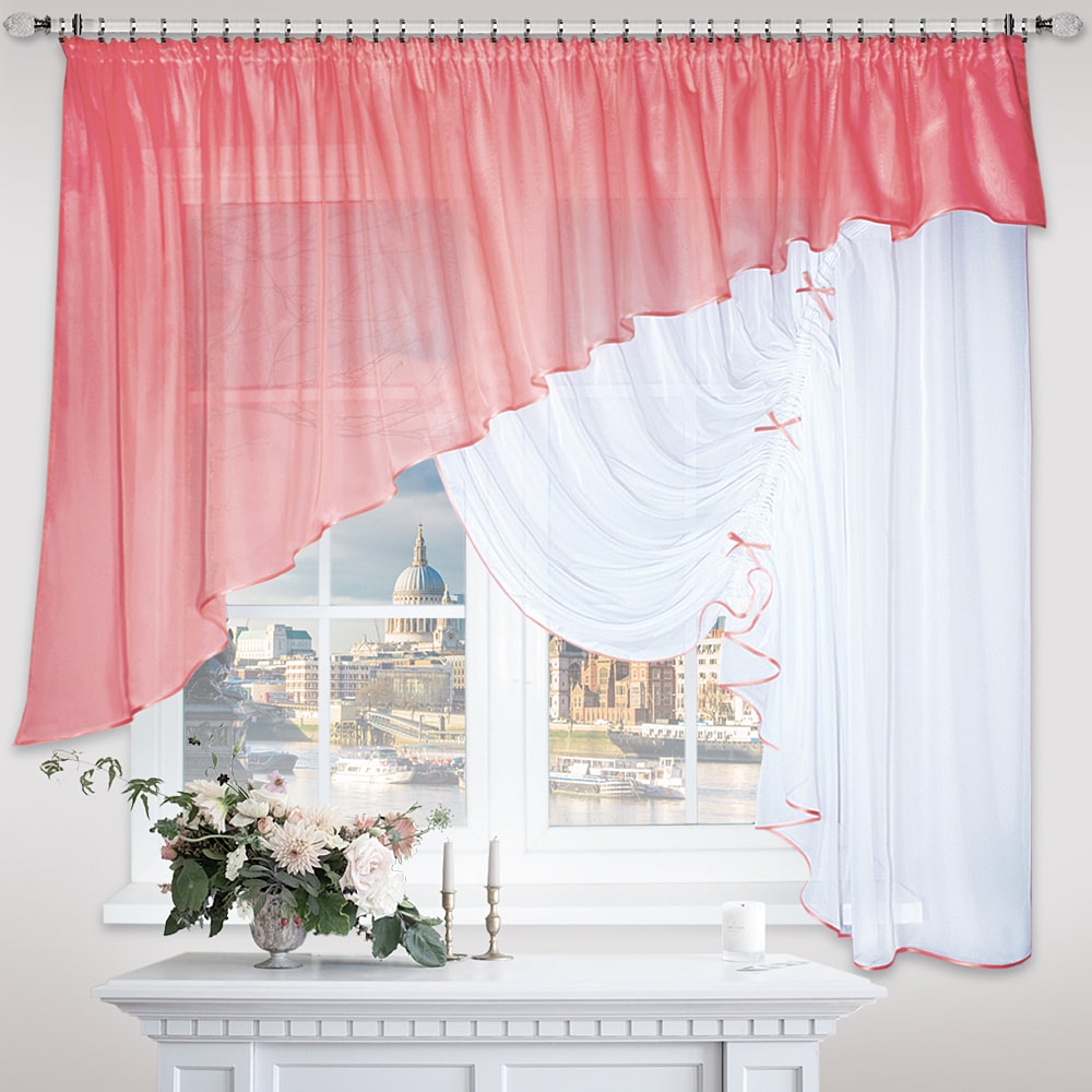 Шторы Джульетта — это сочетание белой и цветной вуали разных форм, которое комбинируется с множеством различных оттенков, также мы пришиваем по периметру изделия бейку в цвет изделия, чтобы она гармонично завершала штору.