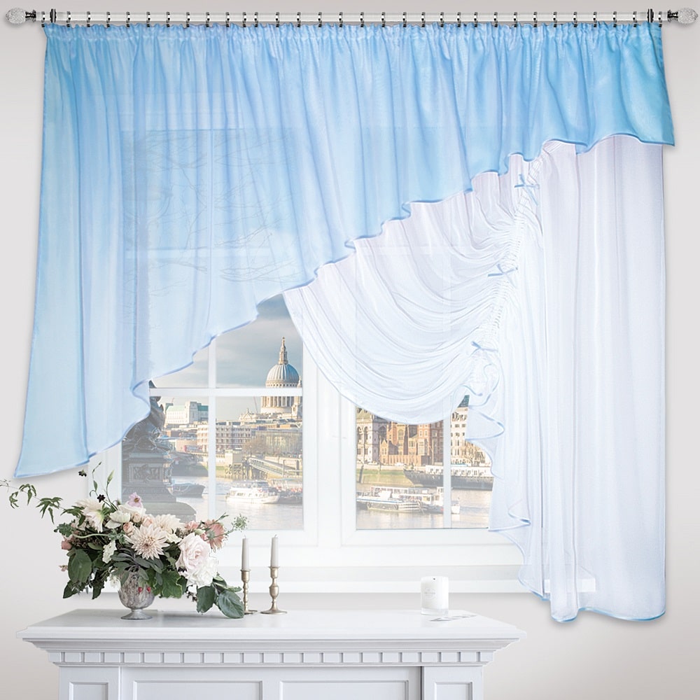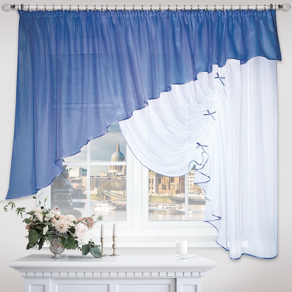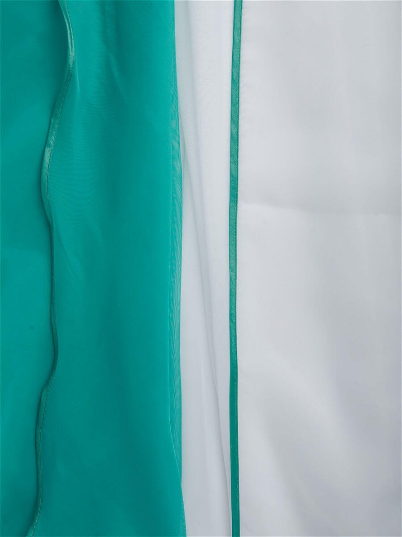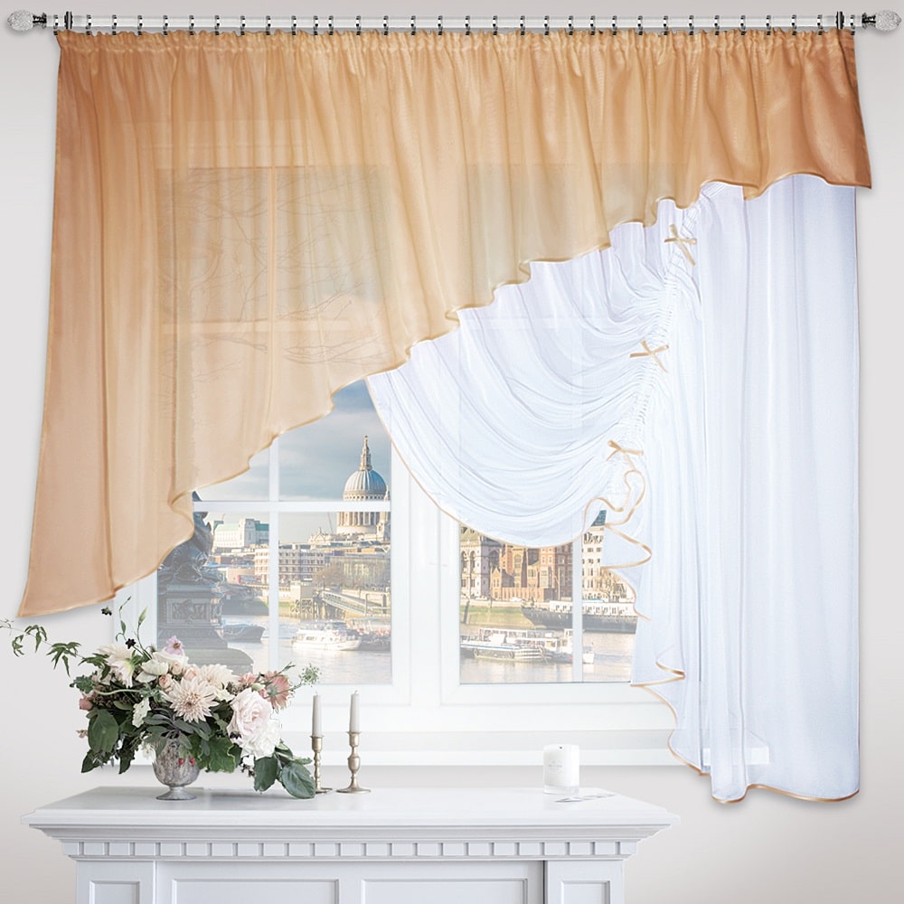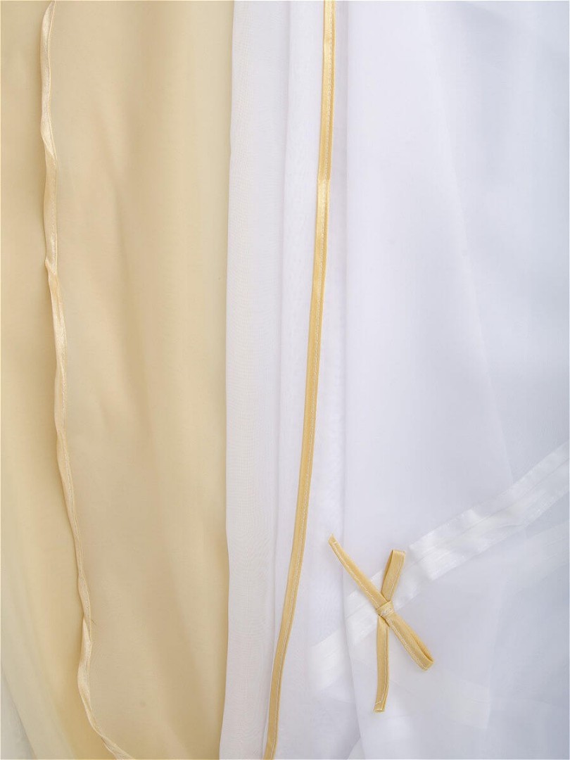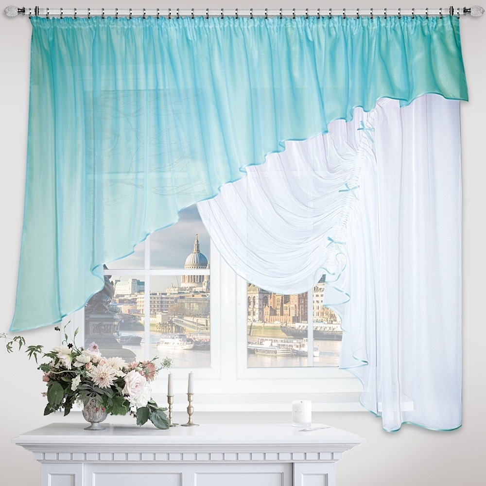 Шторы Джульетта — это сочетание белой и цветной вуали разных форм, которое комбинируется с множеством различных оттенков, также мы пришиваем по периметру изделия бейку в цвет изделия, чтобы она гармонично завершала штору.