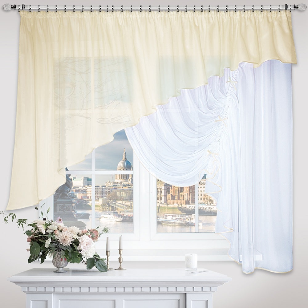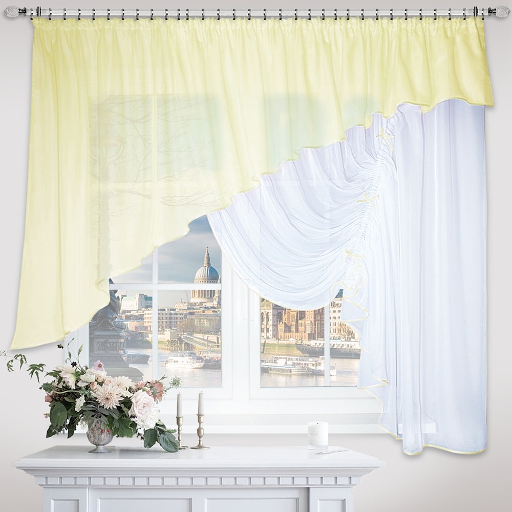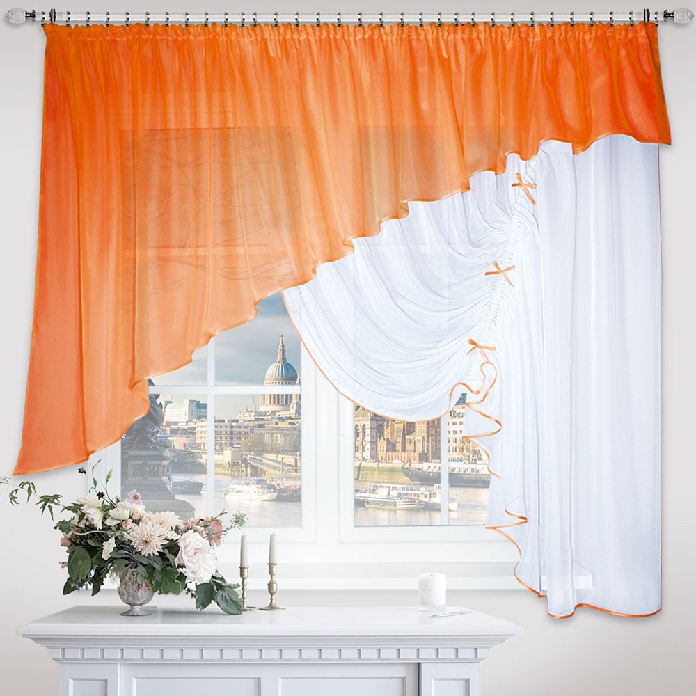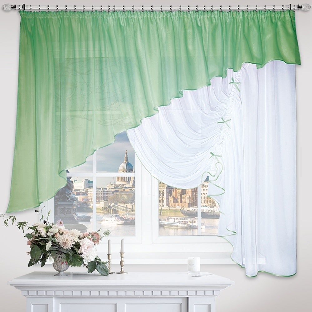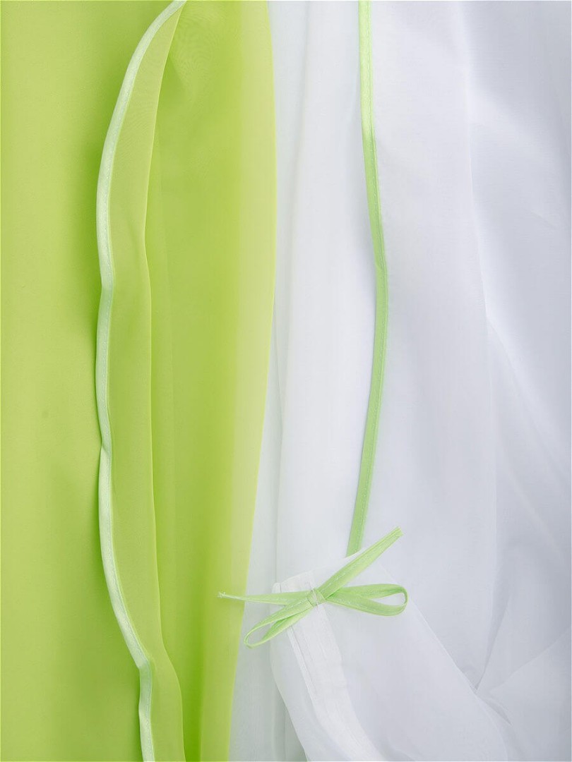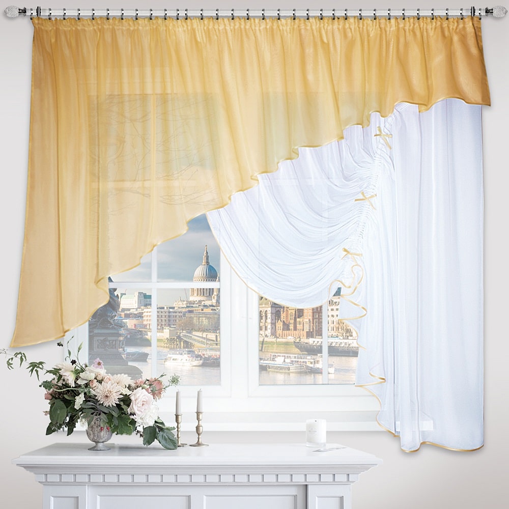 Шторы Джульетта — это сочетание белой и цветной вуали разных форм, которое комбинируется с множеством различных оттенков, также мы пришиваем по периметру изделия бейку в цвет изделия, чтобы она гармонично завершала штору.