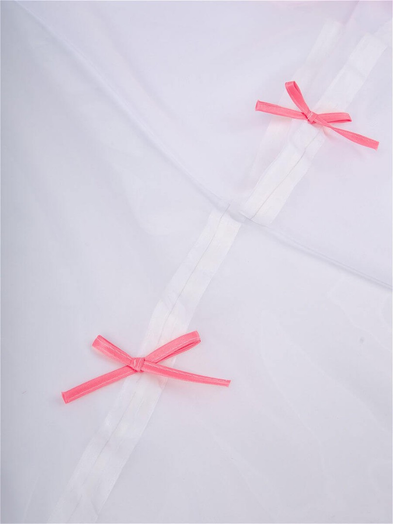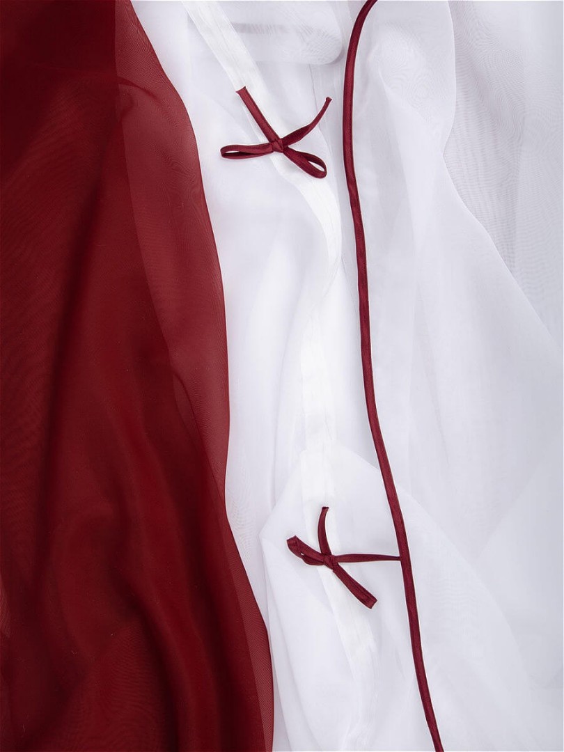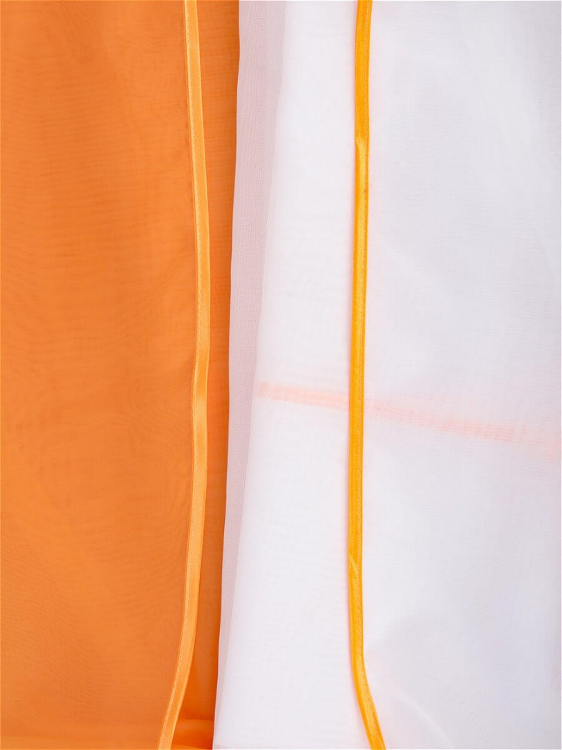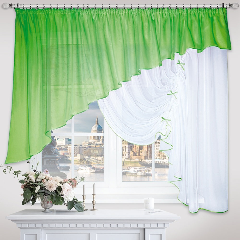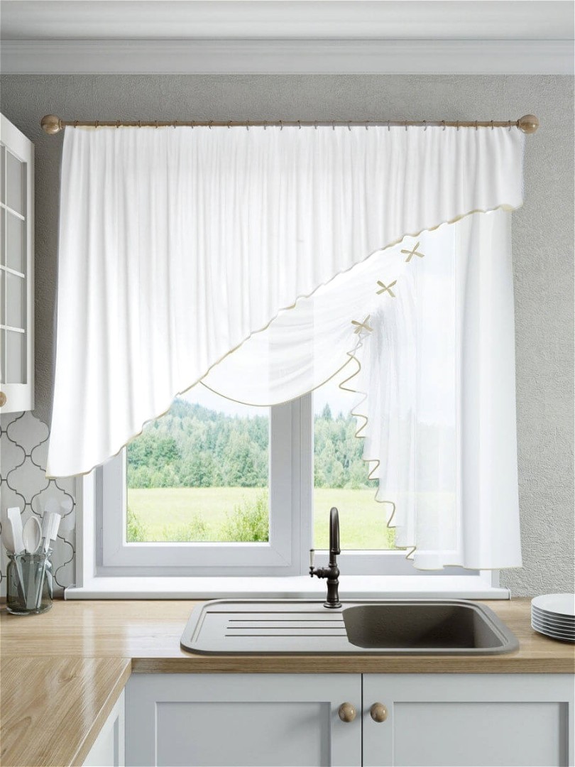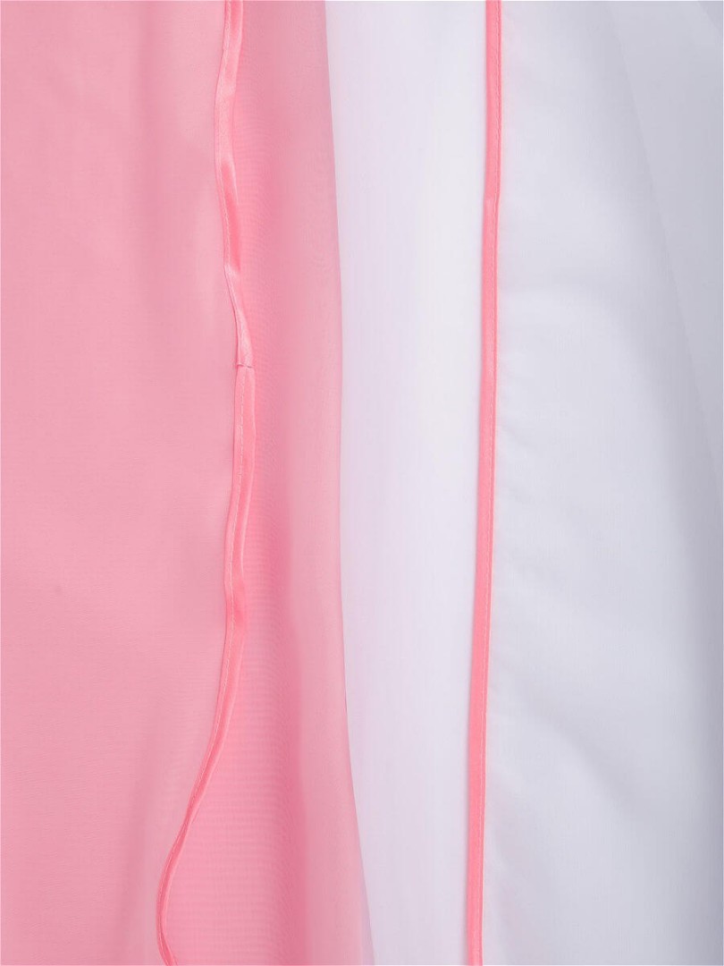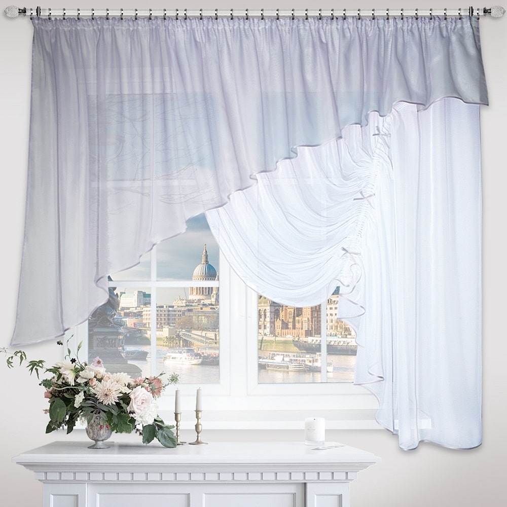 Шторы Джульетта — это сочетание белой и цветной вуали разных форм, которое комбинируется с множеством различных оттенков, также мы пришиваем по периметру изделия бейку в цвет изделия, чтобы она гармонично завершала штору.