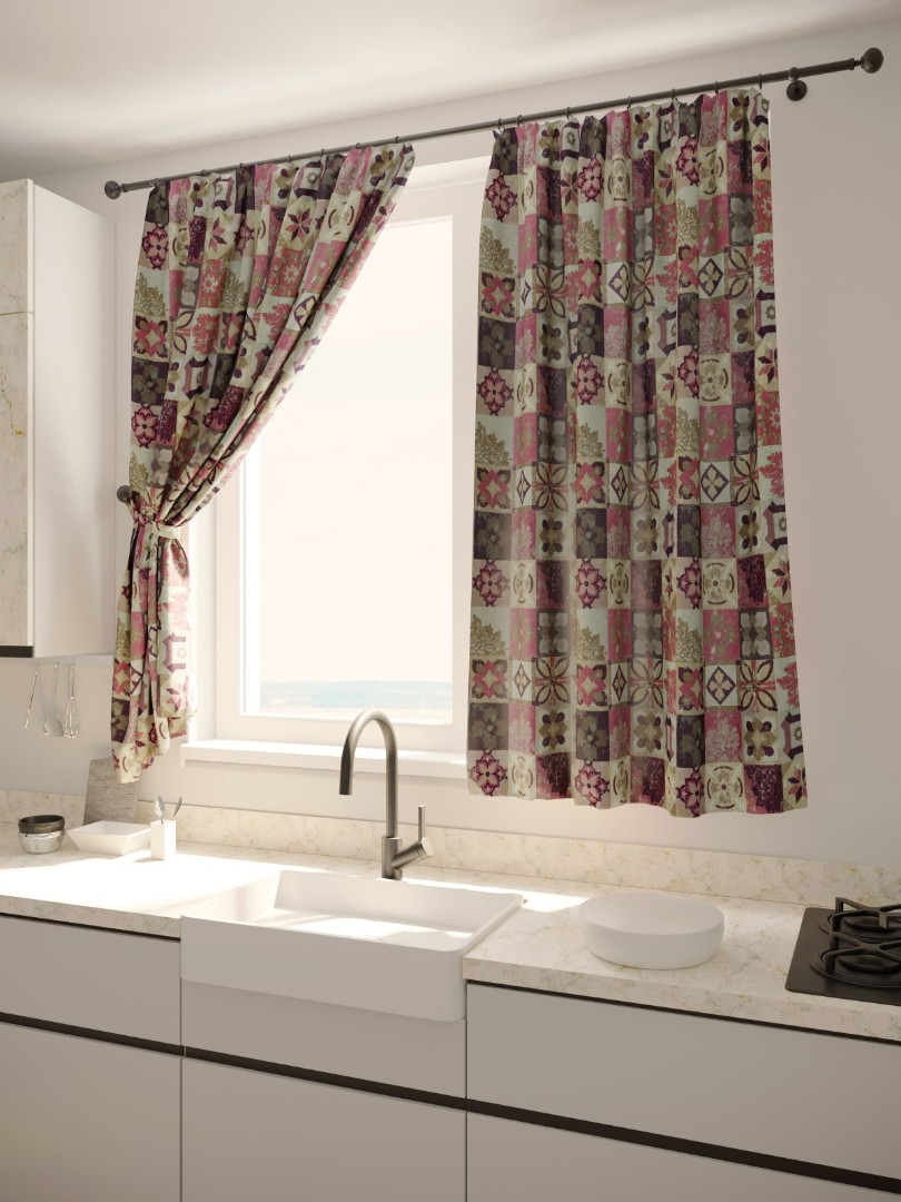 Отшивается комплект штор Майолика из испанской ткани, также мы комплектуем боковые шторы подхватами в цвет ткани, чтобы изделие выглядело завершённым.