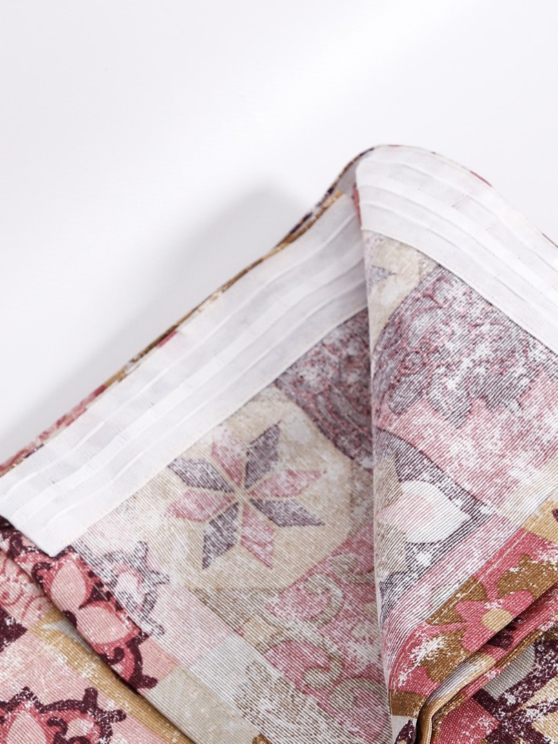 К верхней части штор Майолика пришита шторная лента с тесьмой, с её помощью вы сможете стянуть изделие до нужного вам размера карниза.