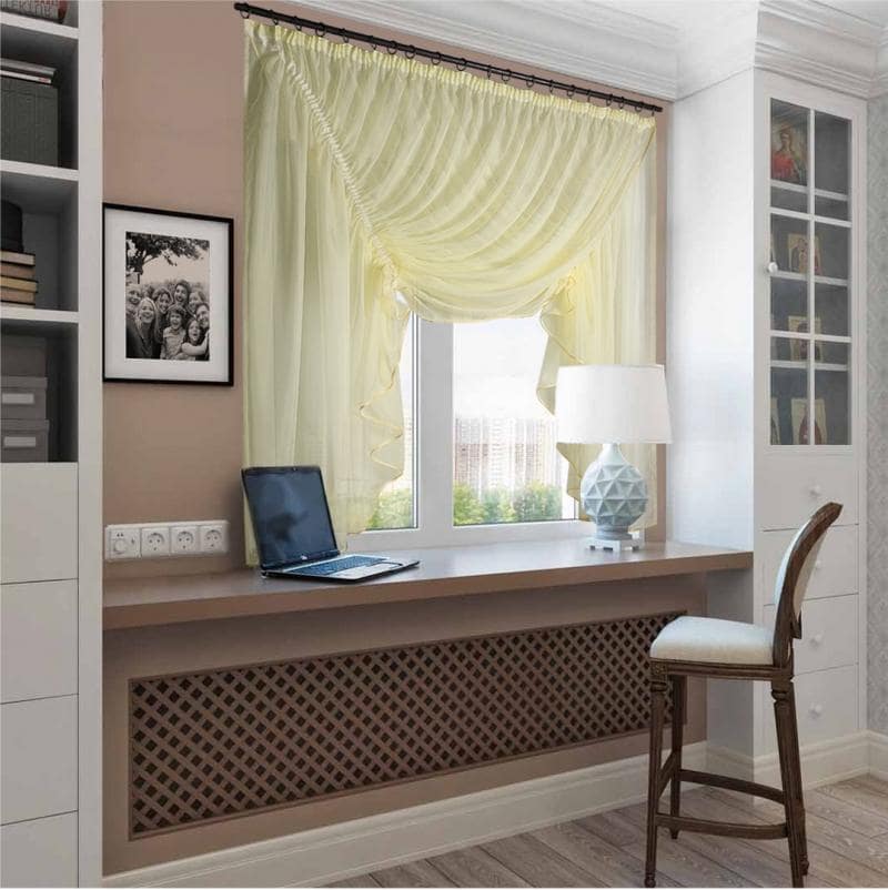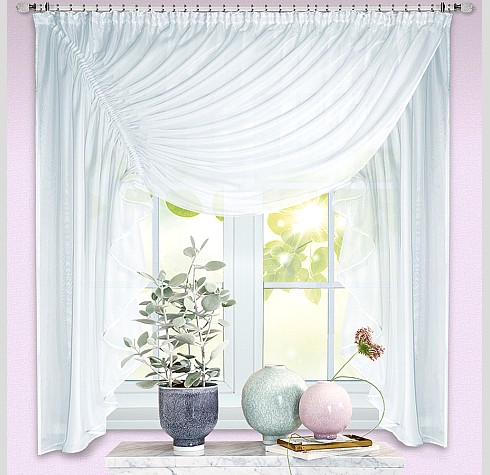 К верхней части штор Рената пришита шторная лента с тесьмой, с её помощью вы сможете стянуть изделие до нужного вам размера карниза.