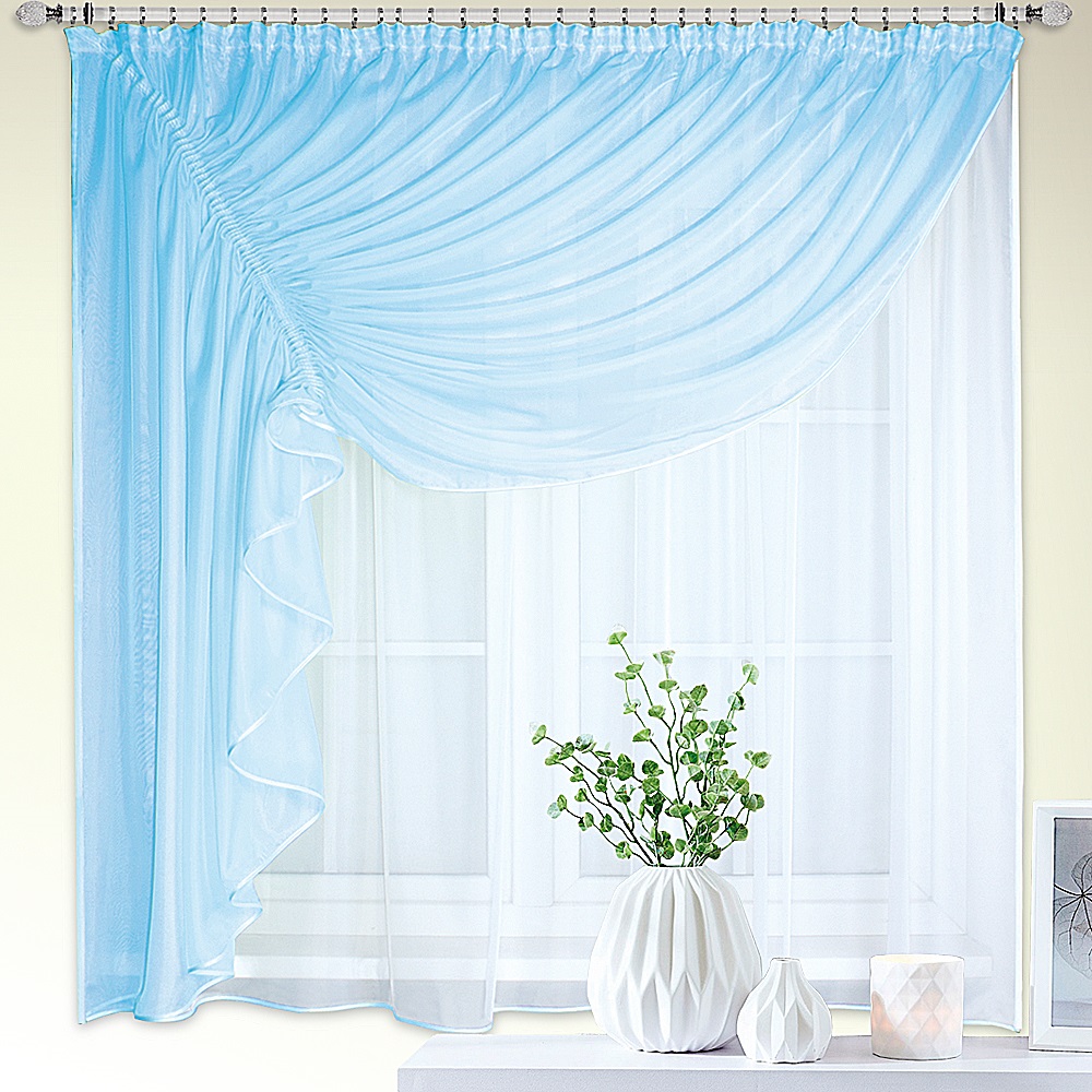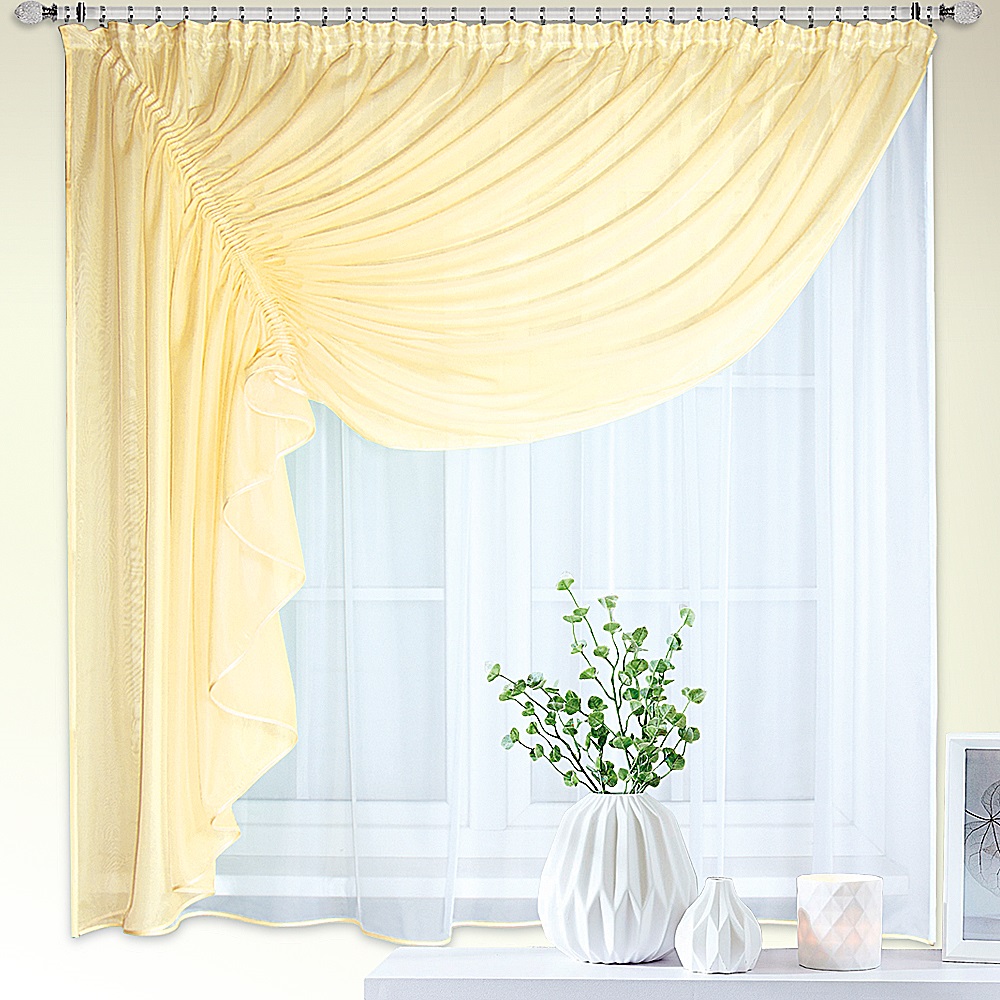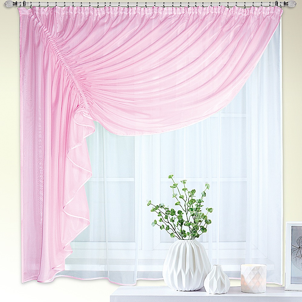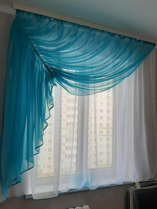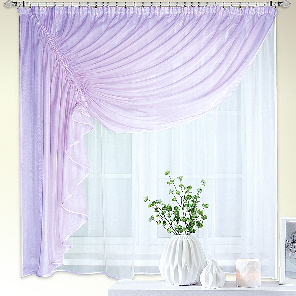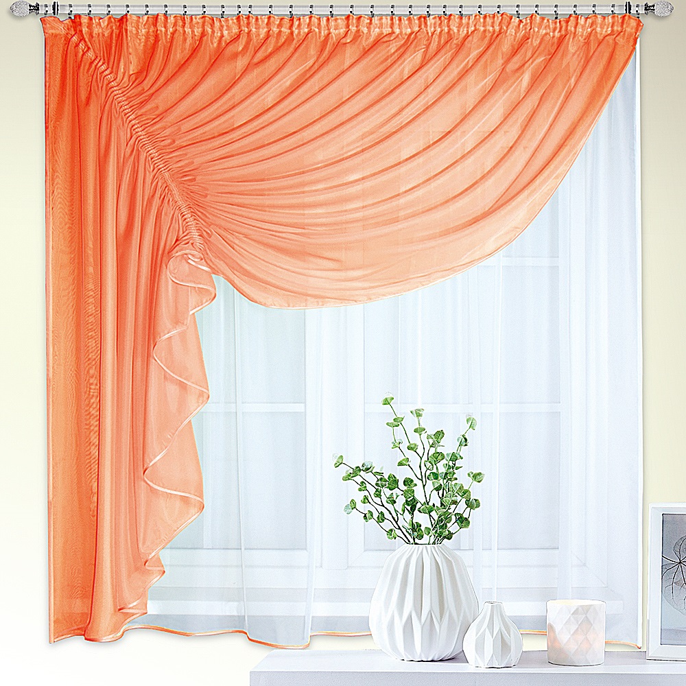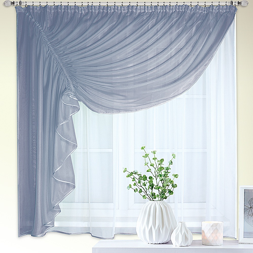 Шторы Ромео — это комплект штор из белой и цветной вуали, которая может располагаться слева или справа по вашему желанию, по периметру пришивается бейка в цвет изделия.