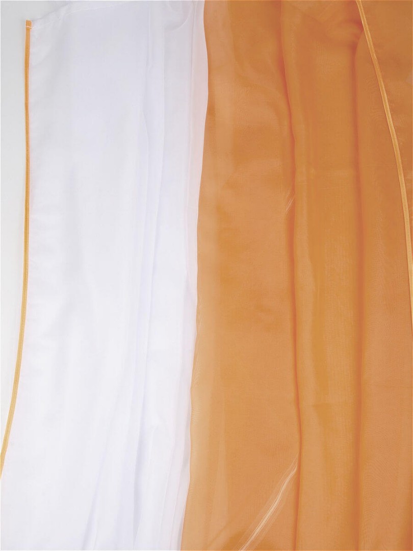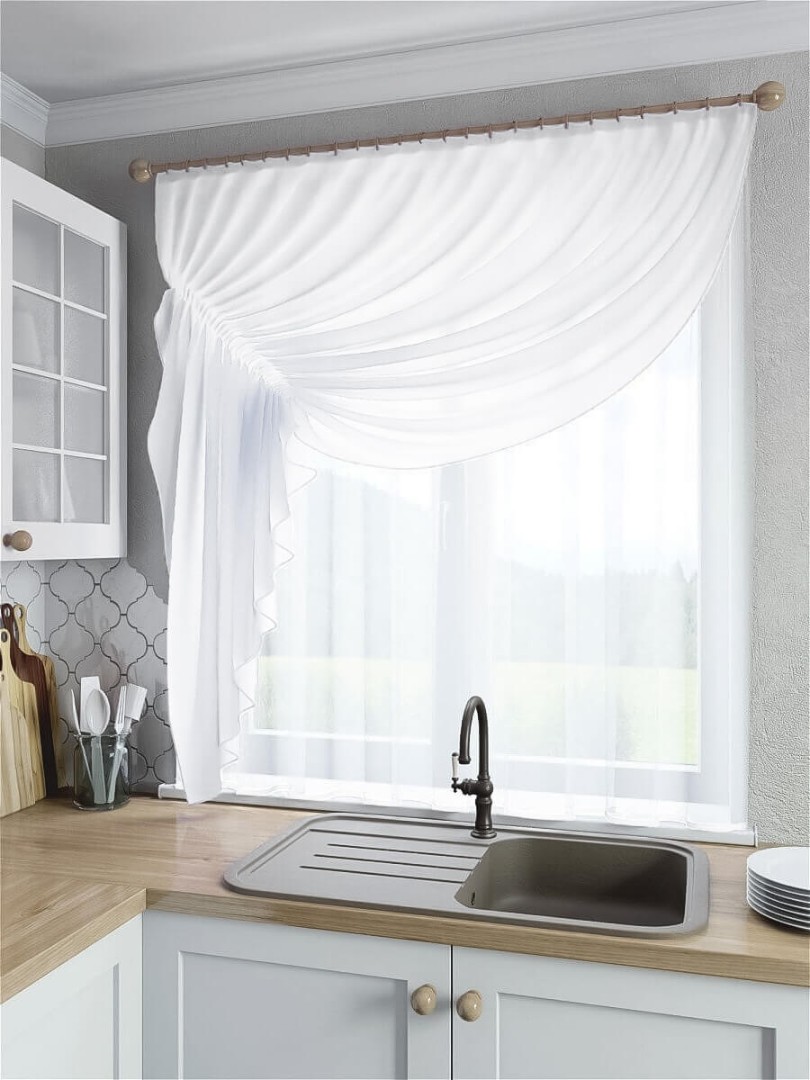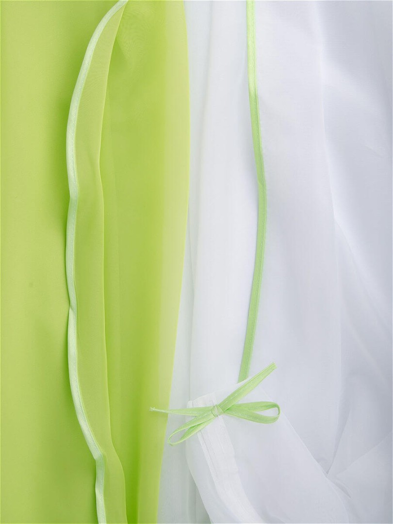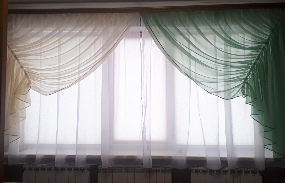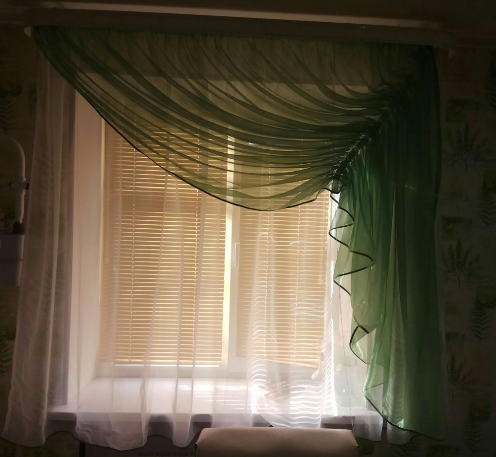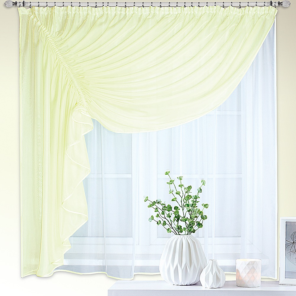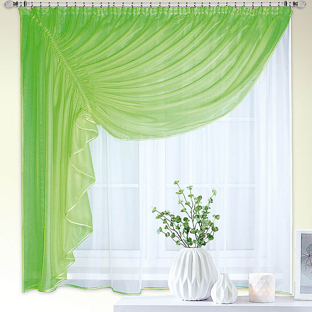 Шторы Ромео — это комплект штор из белой и цветной вуали, которая может располагаться слева или справа по вашему желанию, по периметру пришивается бейка в цвет изделия.