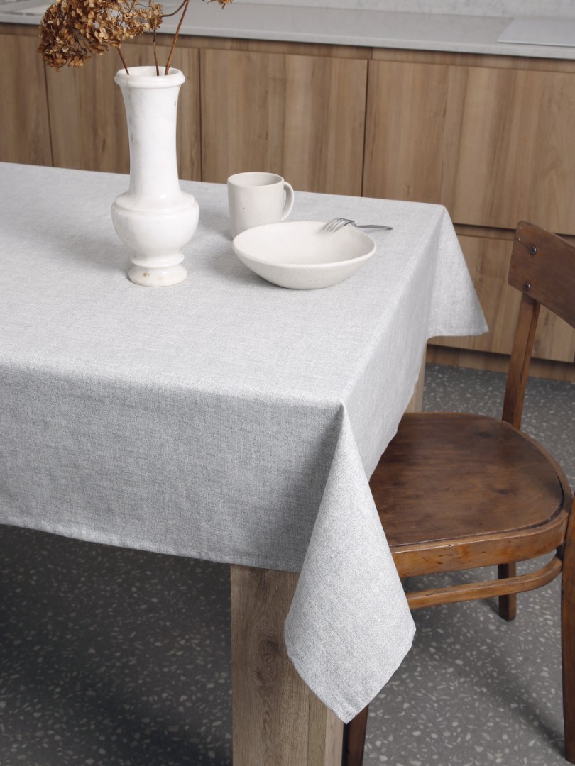 Скатерть на стол - неотъемлемый атрибут защиты стола от повреждений, а также элемент стиля. Скатерть изготовлена из хлопка с плетением рогожка - это плотная ткань с качественно обработанными швами. Материал легко отстирывается, что важно на кухне.