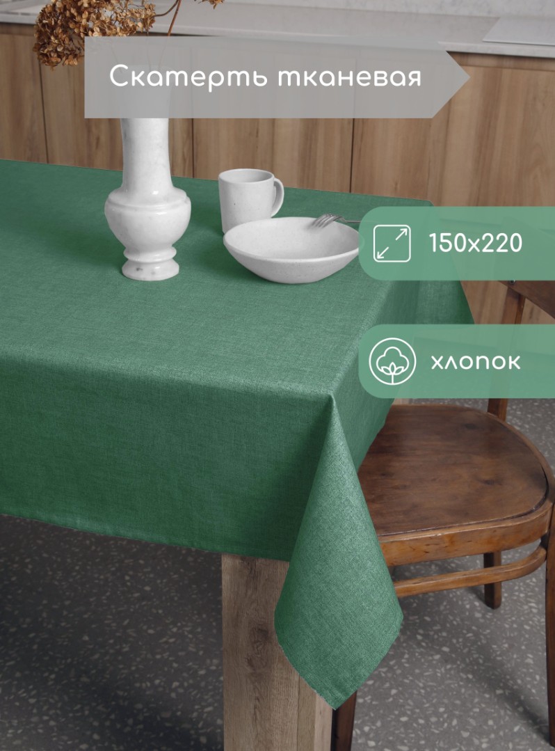 Скатерть на стол - неотъемлемый атрибут защиты стола от повреждений, а также элемент стиля. Скатерть изготовлена из хлопка с плетением рогожка - это плотная ткань с качественно обработанными швами. Материал легко отстирывается, что важно на кухне.